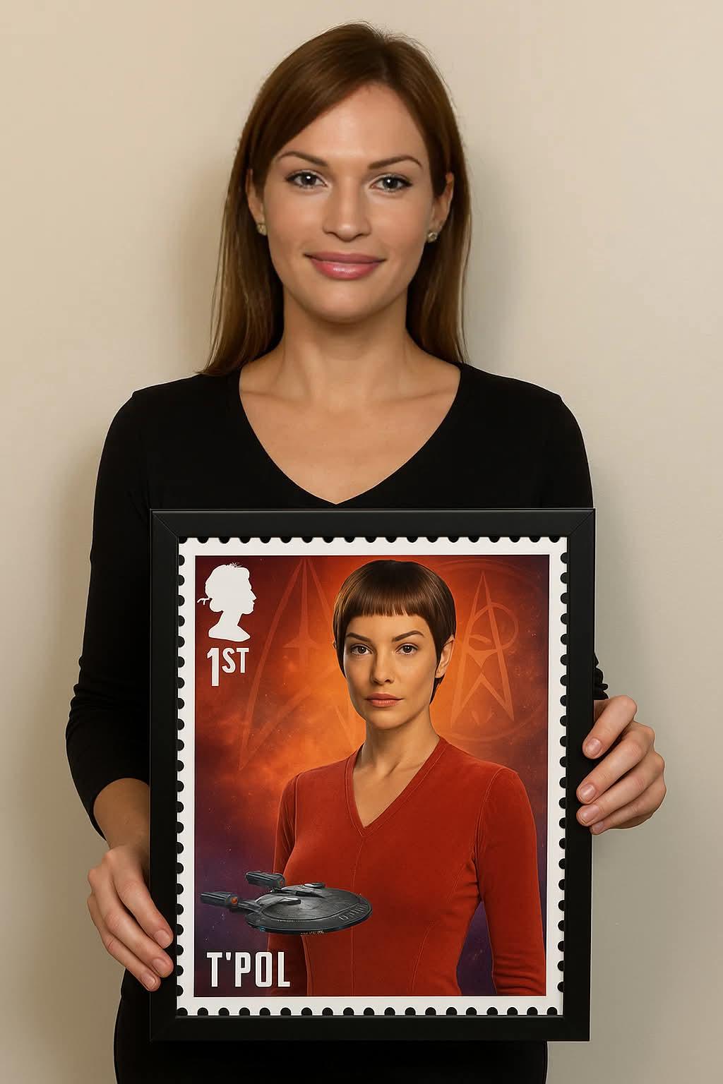 The Enterprise inside the outline of the Vulcan salute ( Spocks iconic hand gesture ) against a blue background. The words Space... The Final Frontier, from Captain Kirks famous voice over appears beneath the stamps against a background of stars. The stamp images were created by the design firm Heads of State of Philadelphia, PA, under the art direction of Antonio Alcala of Alexandria, VA.