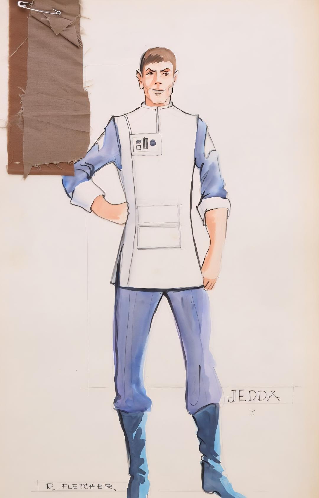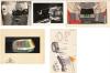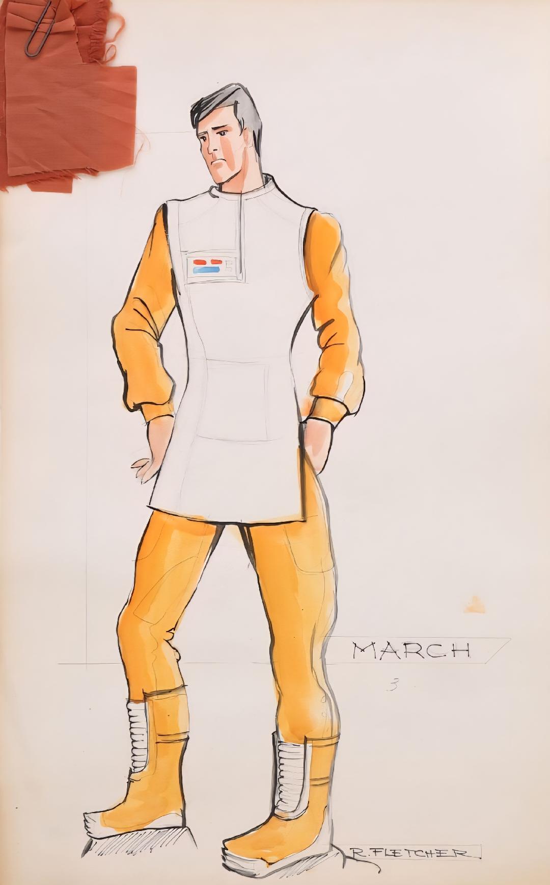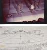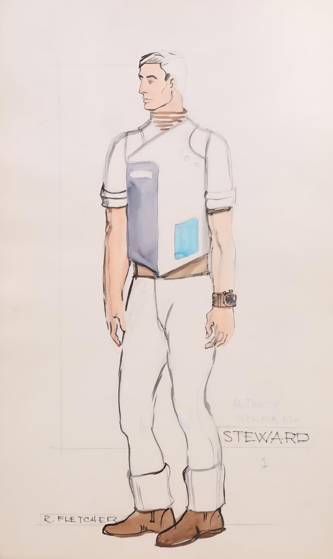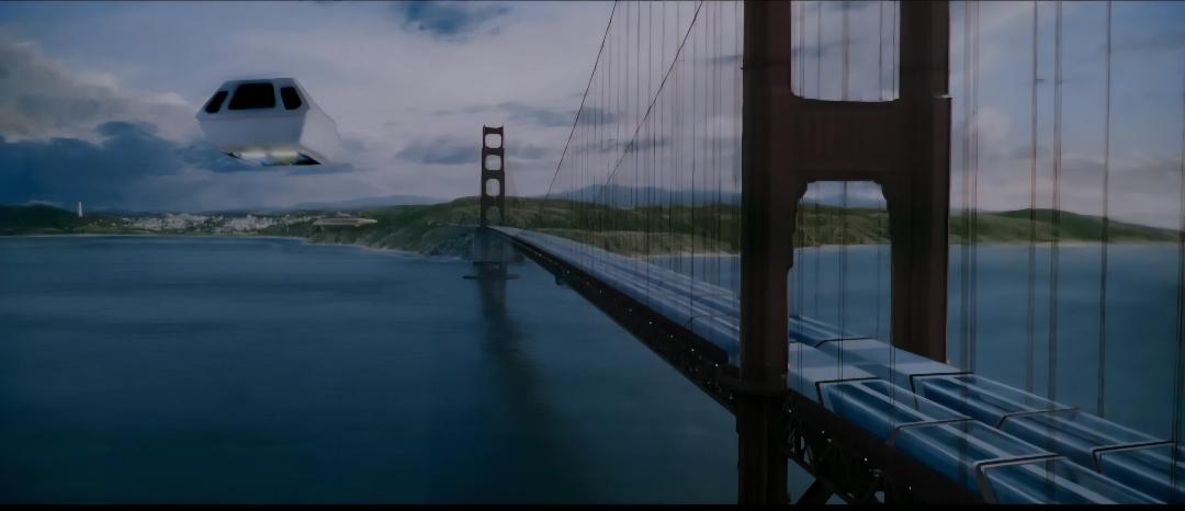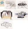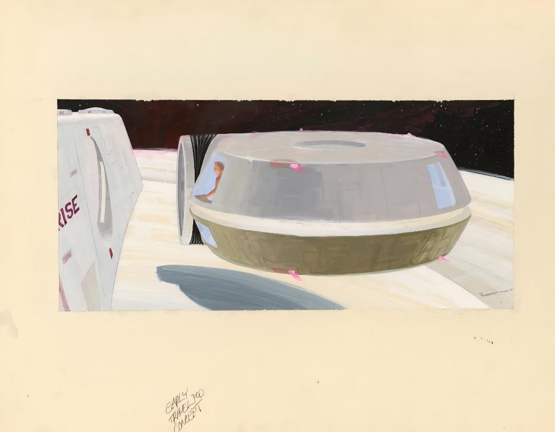 Yuricich created this ornately detailed artwork as a matte study for the final matte painting by painting over a photograph to see how the effects team would combine painting with live-action. Rendered in mixed media, it depicts the Golden Gate Bridge with futuristic passage channels and a shuttle travelling through one. It has two sheets of acetate affixed by black tape, one with hand-painted dots, and the second featuring hand-painted motion arrows, a line of light, and hand-written notes such as the shot "D-1", "8 Seconds," and "36 Frames" among others, and a second sketch of a shuttle in the sky. This lot exhibits discoloration on the board, creased corners, lifted adhesive, and frayed fibers. Dimensions: 30.5" x 20" ( 77.5 cm x 51 cm ).