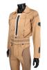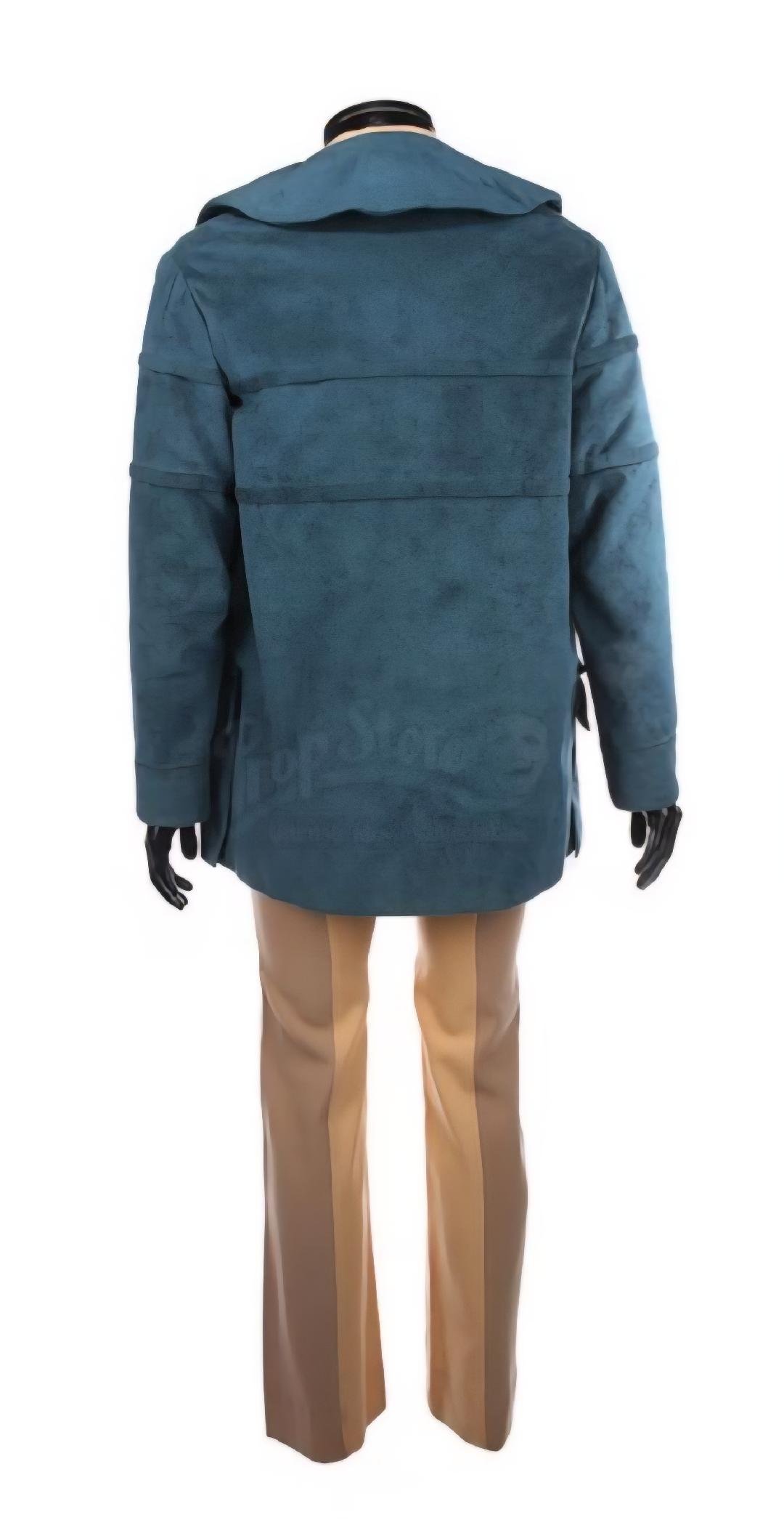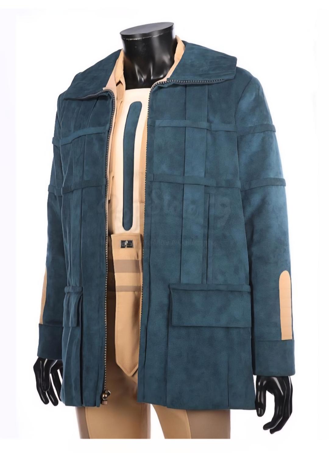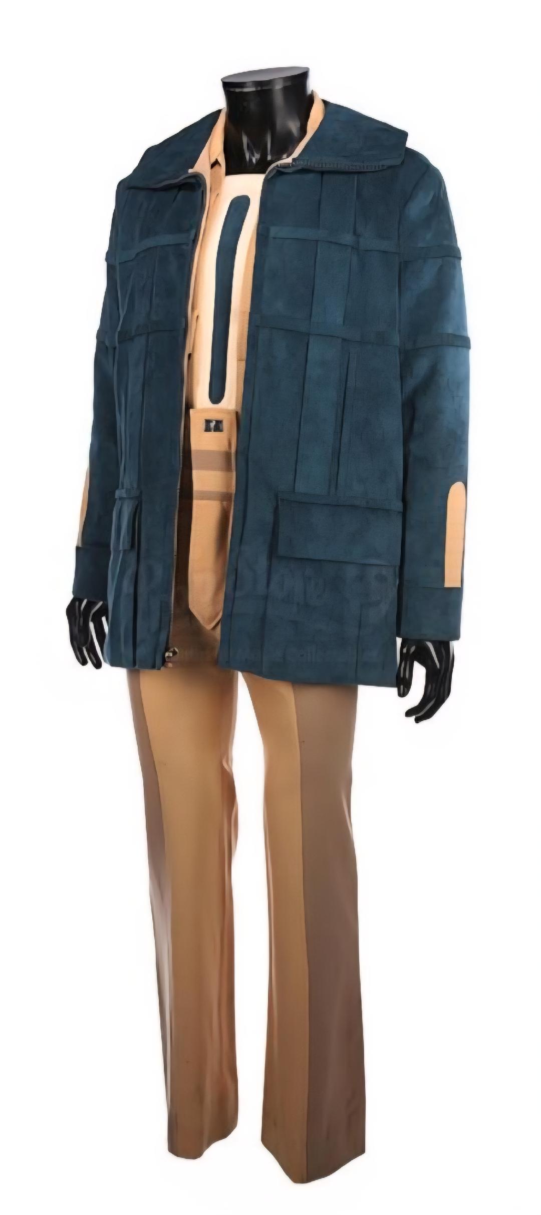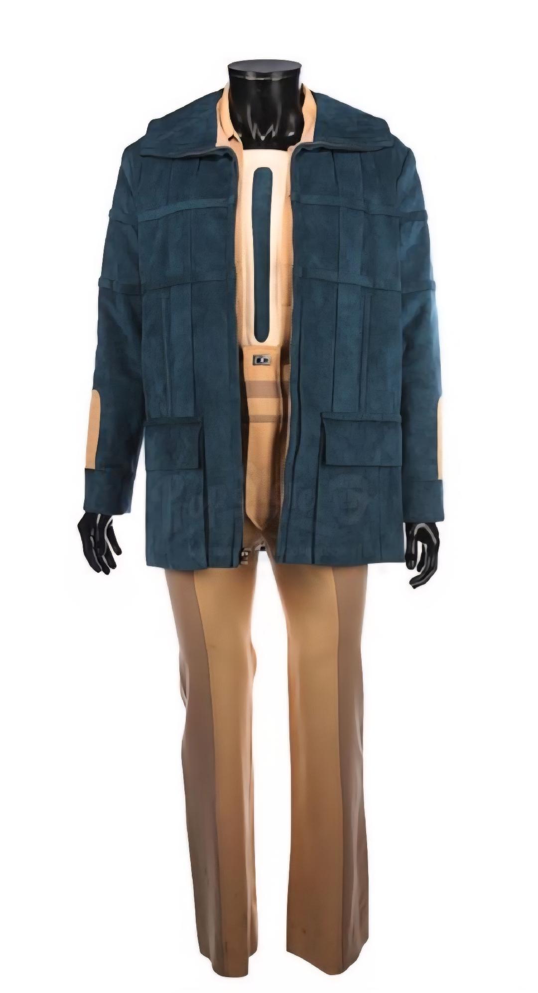 The outfit consists of a jacket and a matching set of khaki shirt and khaki trousers. The jacket is made of blue suede with a large pocket on each side, and features a large metal zip and a beige lining. The shirt zips up at the front, with blue suede detailing down the middle and on each arm, and two pockets on each side, secured with metal poppers. The trousers are made of the same material as the shirt and have a hidden metal fly.