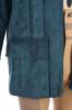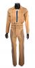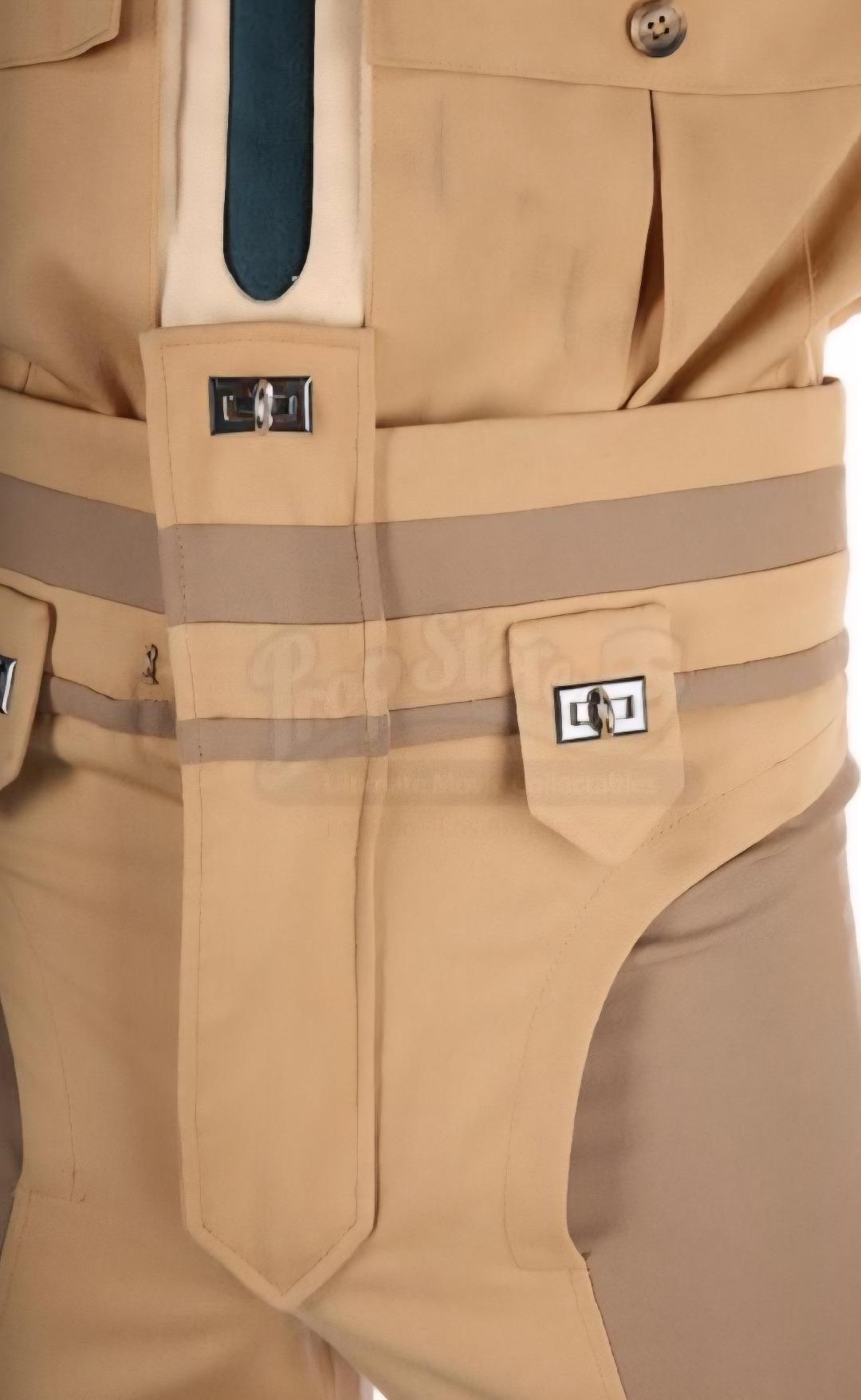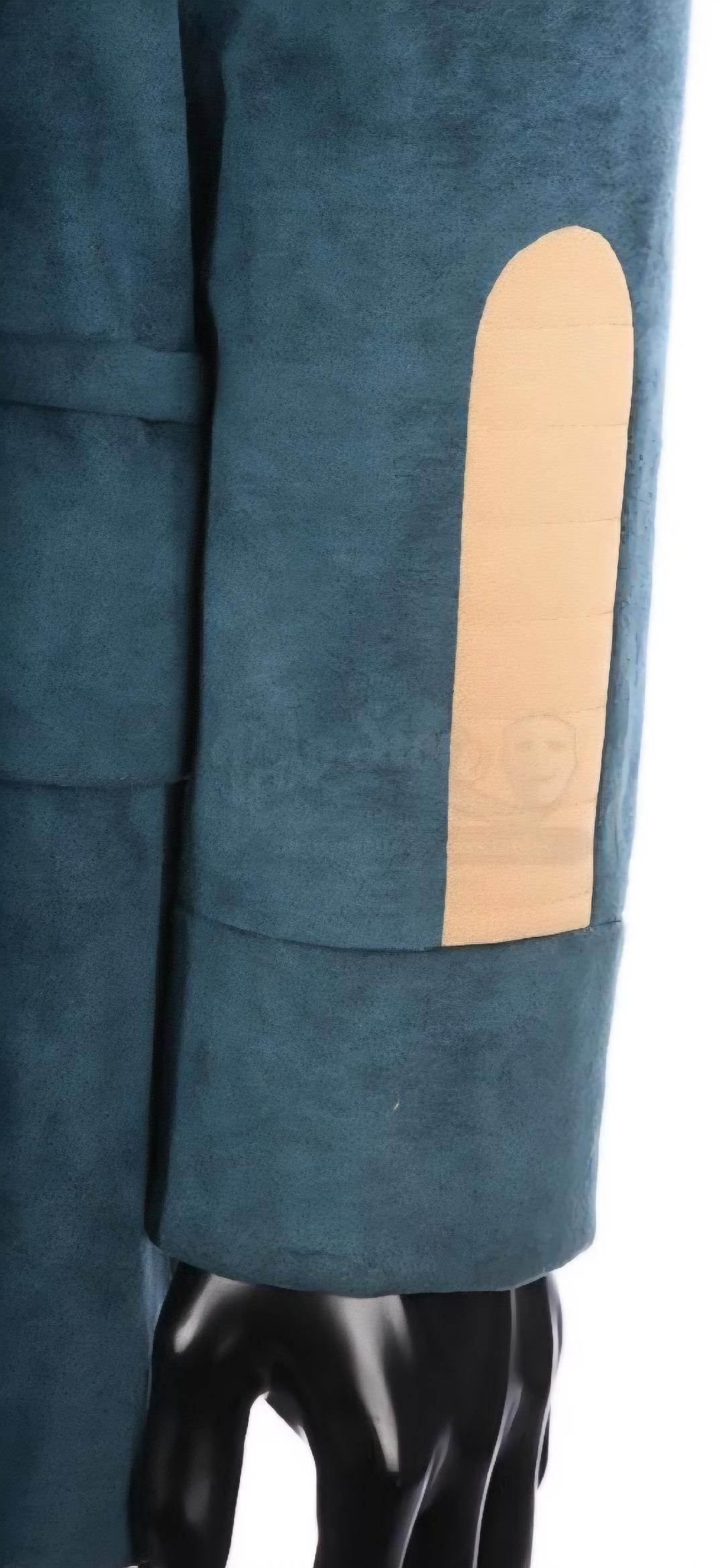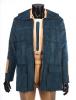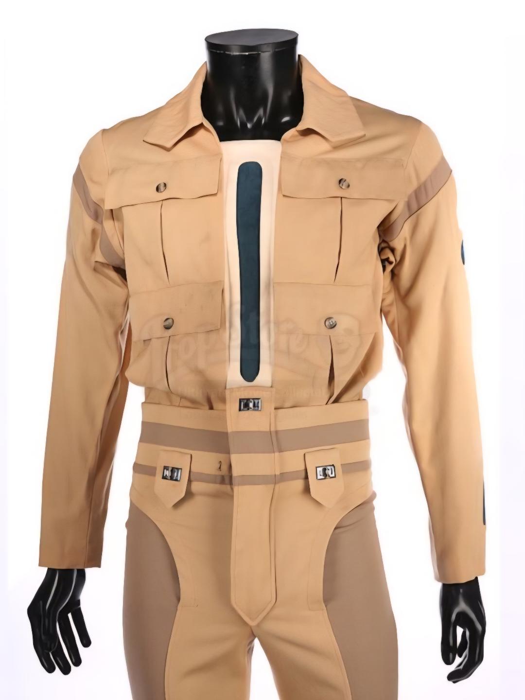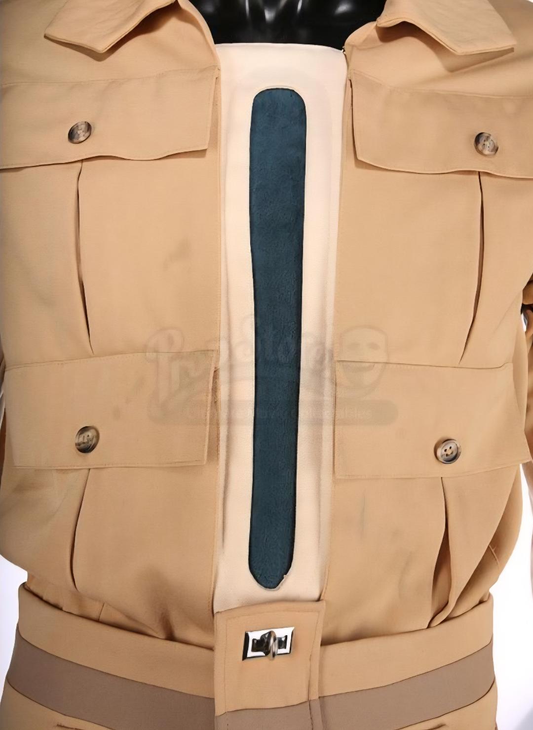 The outfit consists of a jacket and a matching set of khaki shirt and khaki trousers. The jacket is made of blue suede with a large pocket on each side, and features a large metal zip and a beige lining. The shirt zips up at the front, with blue suede detailing down the middle and on each arm, and two pockets on each side, secured with metal poppers. The trousers are made of the same material as the shirt and have a hidden metal fly.