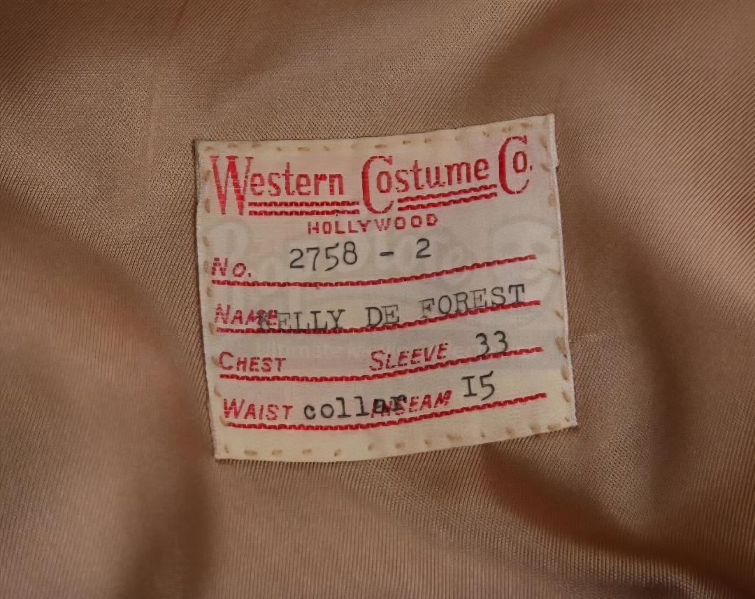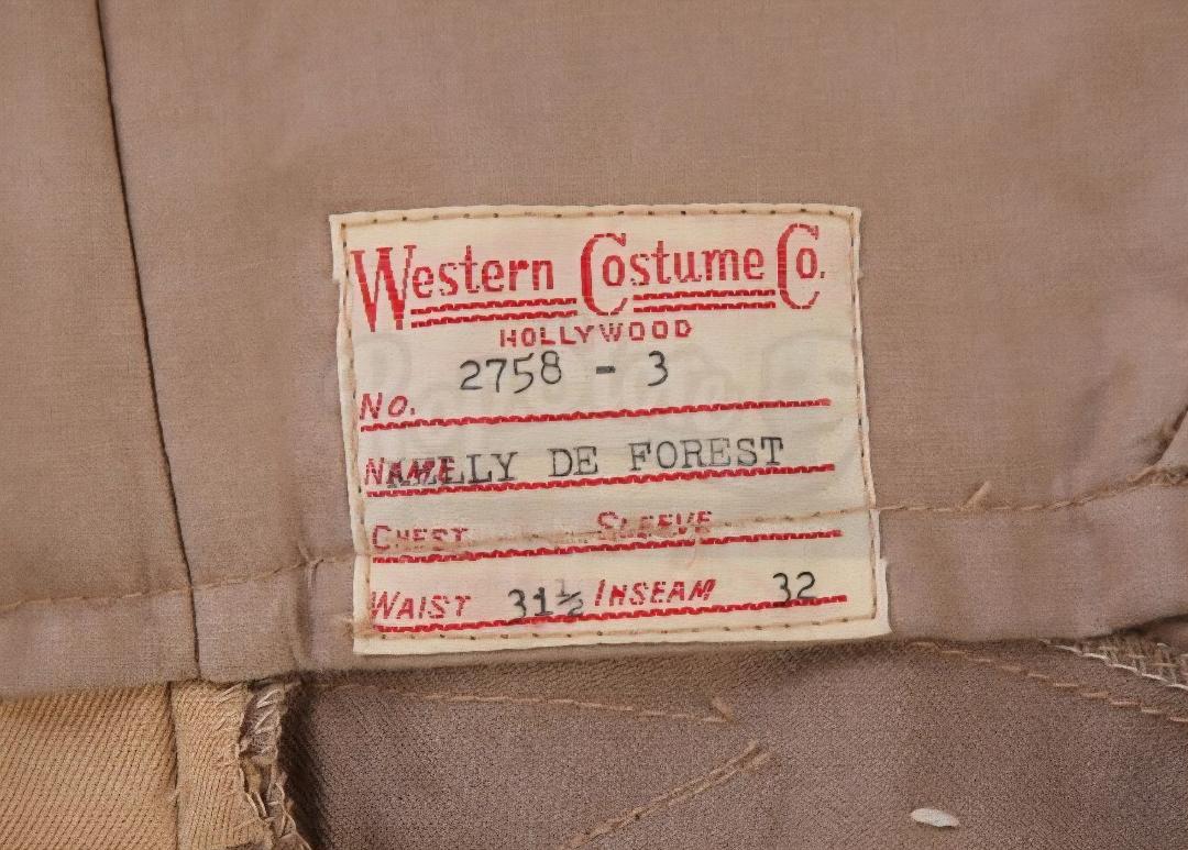 A label in the collar from "Western Costume Co. Hollywood" has "Kelly De Forest sic" printed alongside other information, including sleeve length and neck measurements. The trousers also feature a costumier label reading "Kelly De Forest sic" and his waist ( "31 1/2" ) and inseam ( "32" ) measurements.