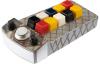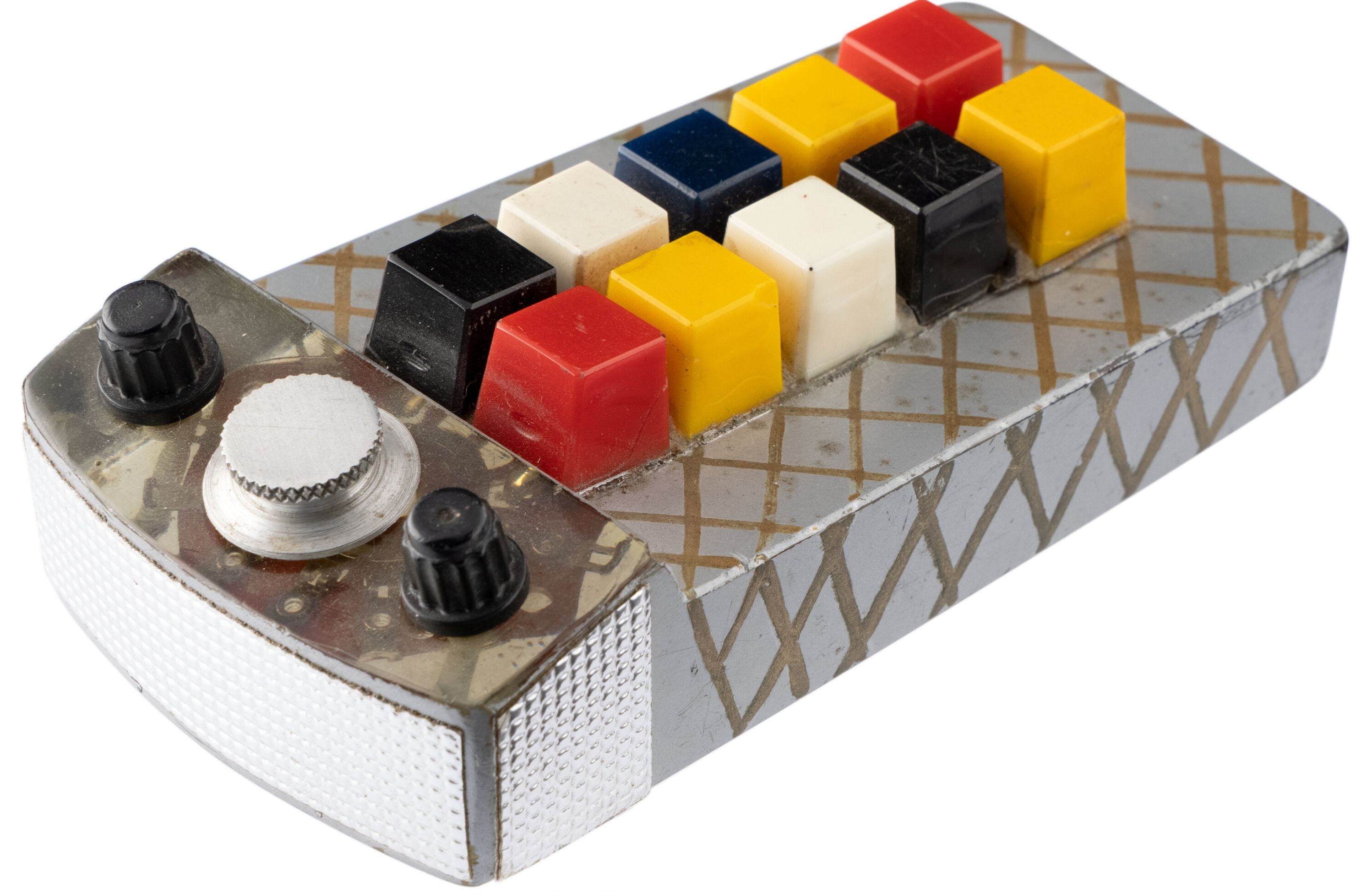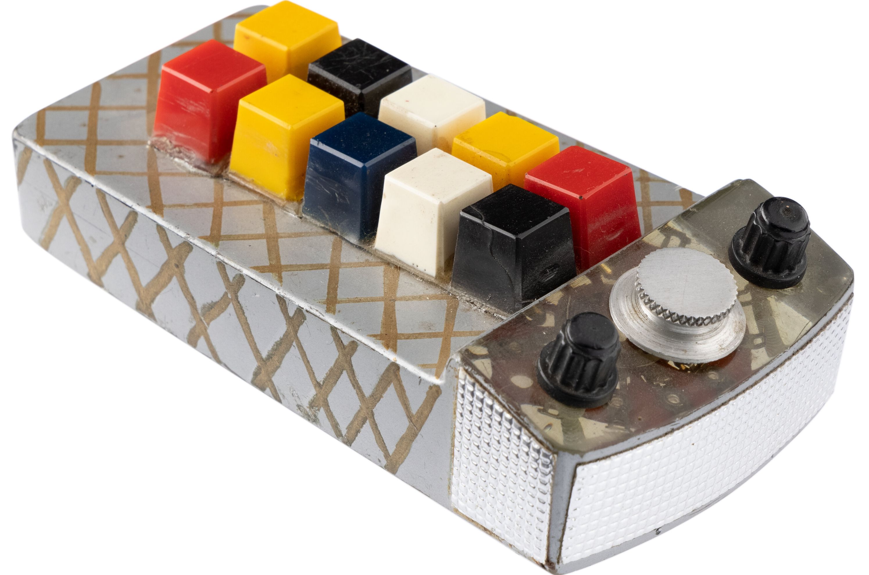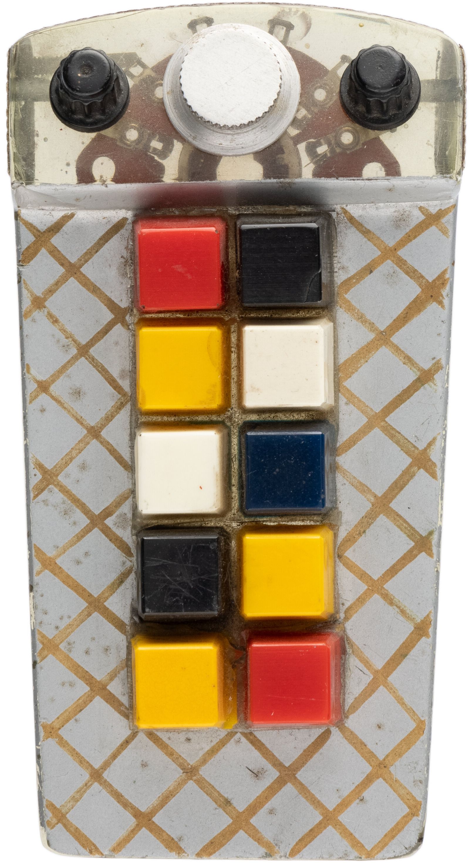 acrylic with plastic and aluminum static knobs and multi-colored square buttons. Expertly hand-painted in industrial gray enamels