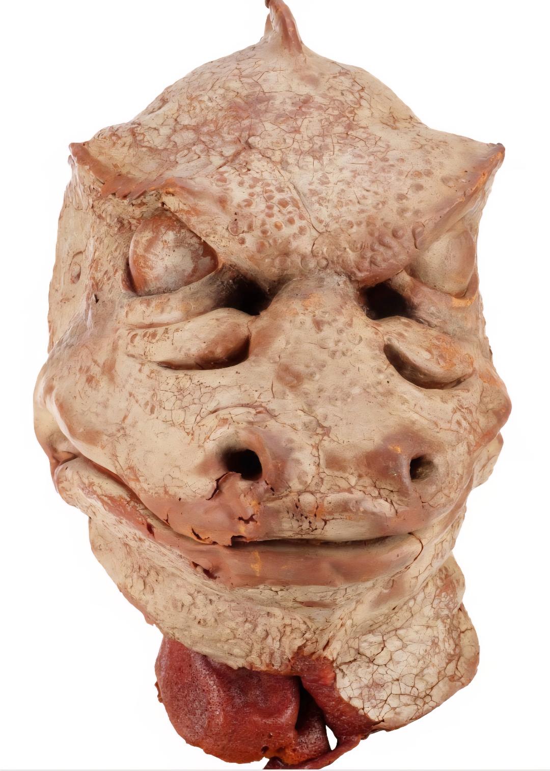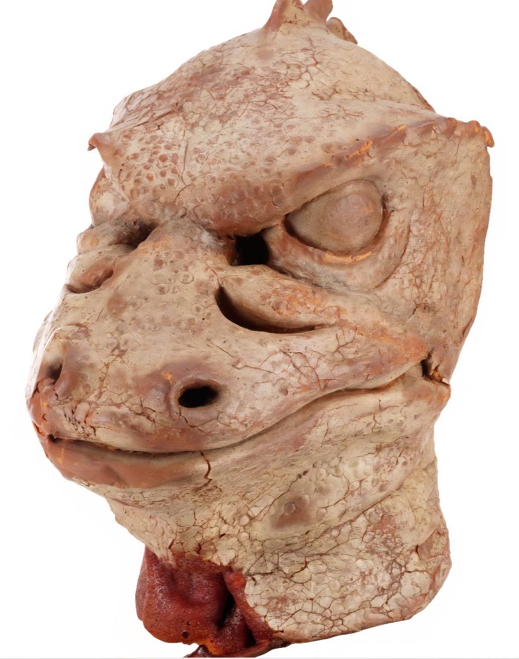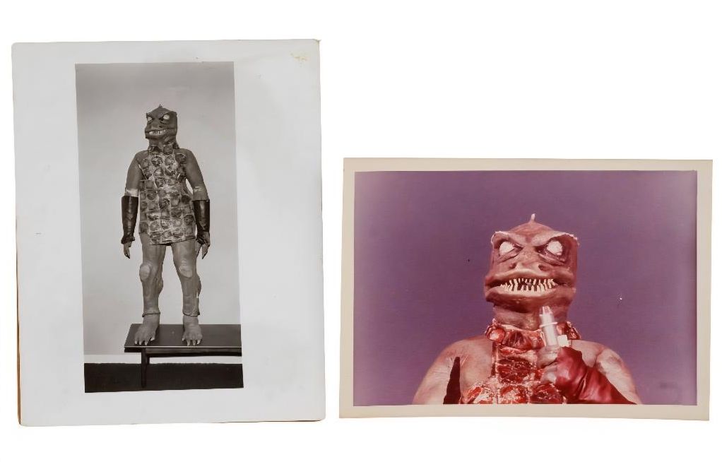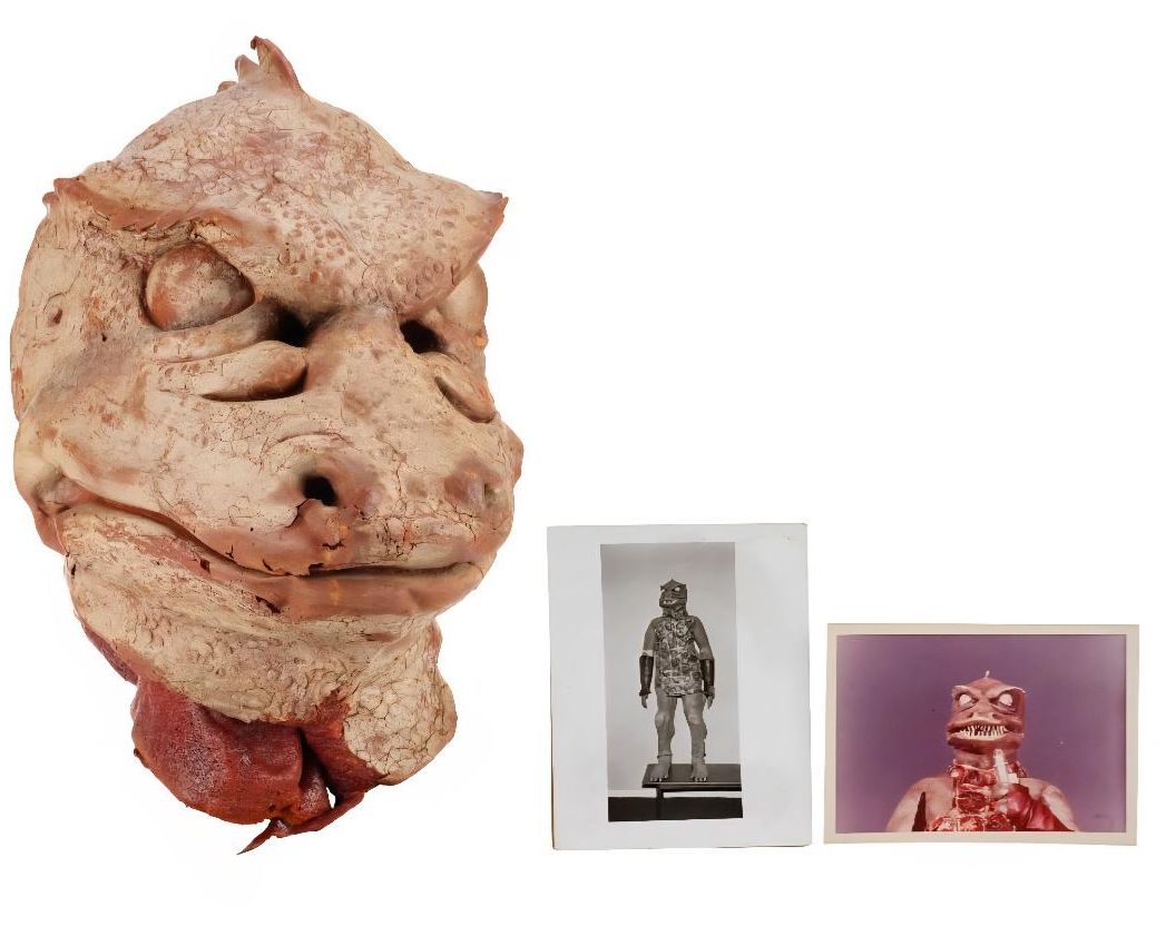 This casting includes a hollow latex and polyfoam Gorn head, cast from original molds. The latex has hardened with age, and the lower right section of the head is missing its latex skin, exposing raw polyfoam beneath. The surface exhibits significant discoloration, holes in several of the spikes, and signs of crumbling throughout. Also included is a color photo of the Gorn's head, and black and white photo of what appears to be the production used Gorn costume labeled on the back "Gorn in my office original Polaroid by Bob Justman." Robert H. "Bob" Justman worked closely with Gene Roddenberry as an associate producer ( Seasons 1 and 2 ) and co-producer ( Season 3 ) on the original Star Trek series, and later returned as a supervising and consulting producer for the first season of Star Trek: The Next Generation before retiring. Dimensions ( Head ): 14.5" x 10.5" x 17.5" ( 37 cm x 26.75 cm x 44.5 cm ).