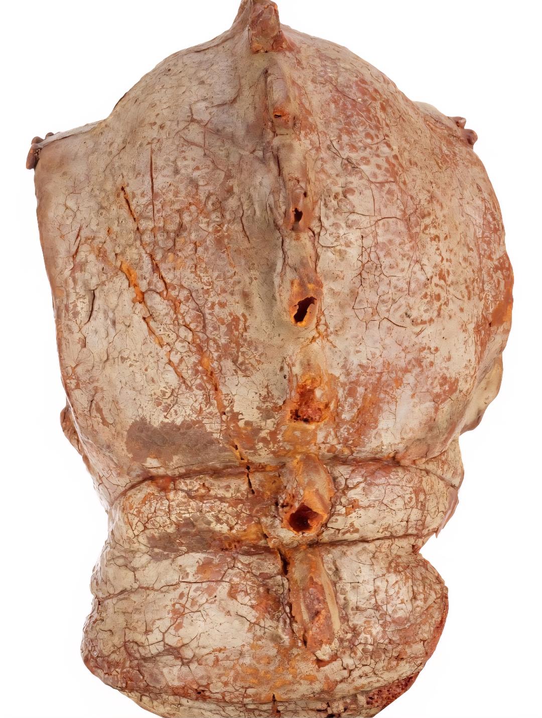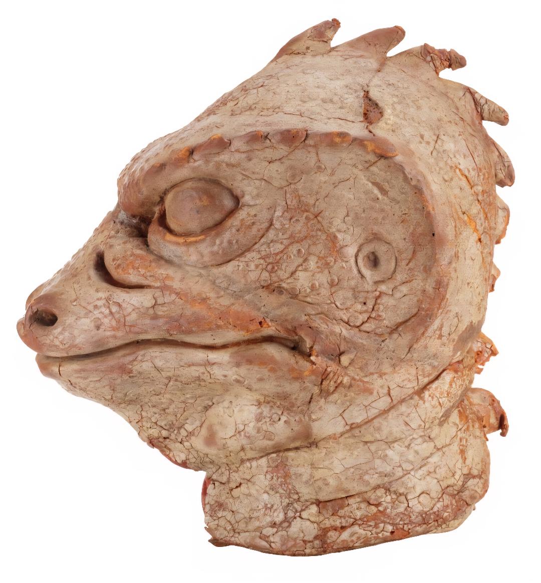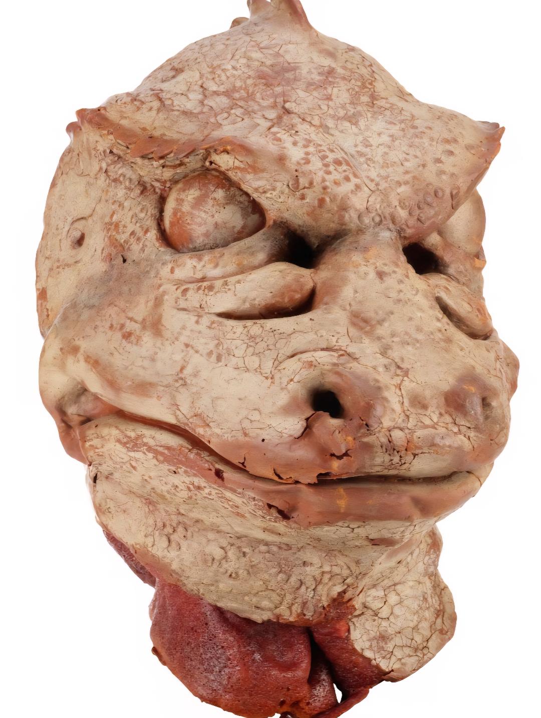 This casting includes a hollow latex and polyfoam Gorn head, cast from original molds. The latex has hardened with age, and the lower right section of the head is missing its latex skin, exposing raw polyfoam beneath. The surface exhibits significant discoloration, holes in several of the spikes, and signs of crumbling throughout. Also included is a color photo of the Gorn's head, and black and white photo of what appears to be the production used Gorn costume labeled on the back "Gorn in my office original Polaroid by Bob Justman." Robert H. "Bob" Justman worked closely with Gene Roddenberry as an associate producer ( Seasons 1 and 2 ) and co-producer ( Season 3 ) on the original Star Trek series, and later returned as a supervising and consulting producer for the first season of Star Trek: The Next Generation before retiring. Dimensions ( Head ): 14.5" x 10.5" x 17.5" ( 37 cm x 26.75 cm x 44.5 cm ).