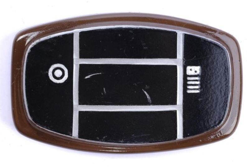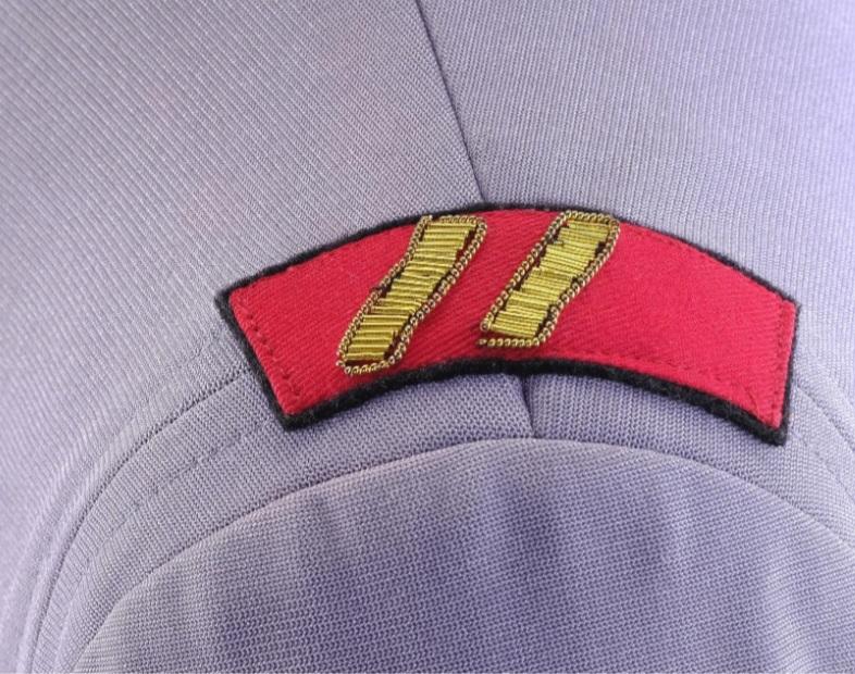 This grey polyester blend Starfleet Class D uniform consists of a full-length grey jumpsuit with a functioning pocket and a Starfleet insignia emblem on the chest. It features a fastening strip and clasp size adjustment on the ankle cuff, and a sewn in Western Costume Co. label marked "James Doohen" on the interior. Also included is a black, brown, and silver wooden replica bio monitor, two replica rank braids on the shoulders, and a pair of replica grey shoes added to complete the costume. The costume exhibits minor signs of wear from age and use throughout.