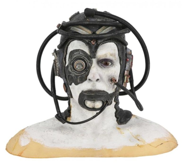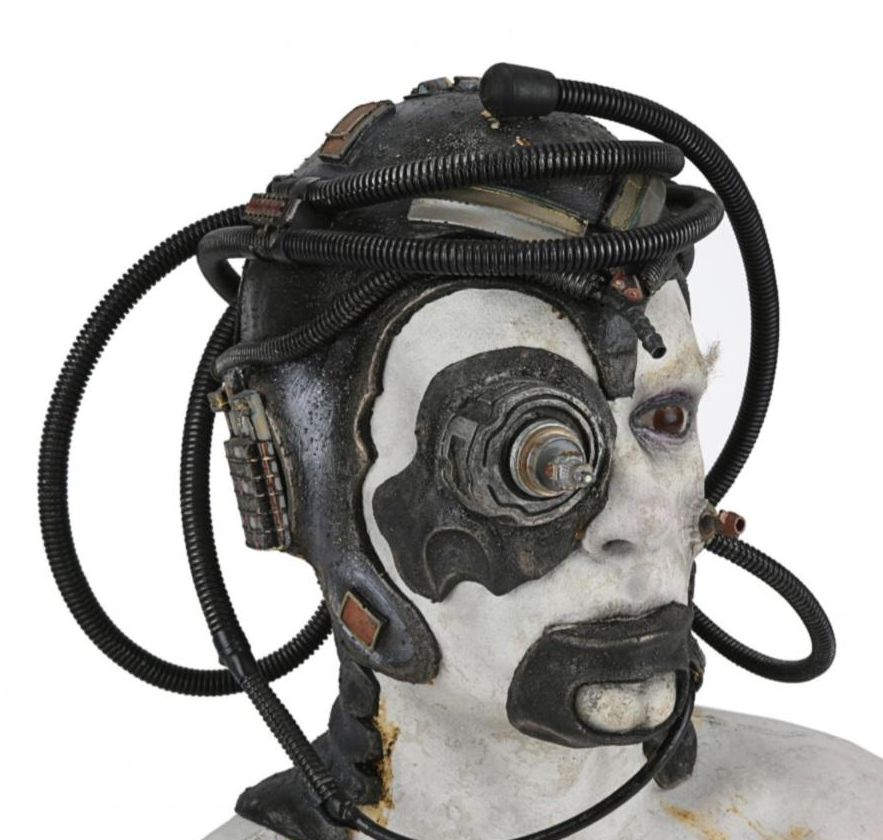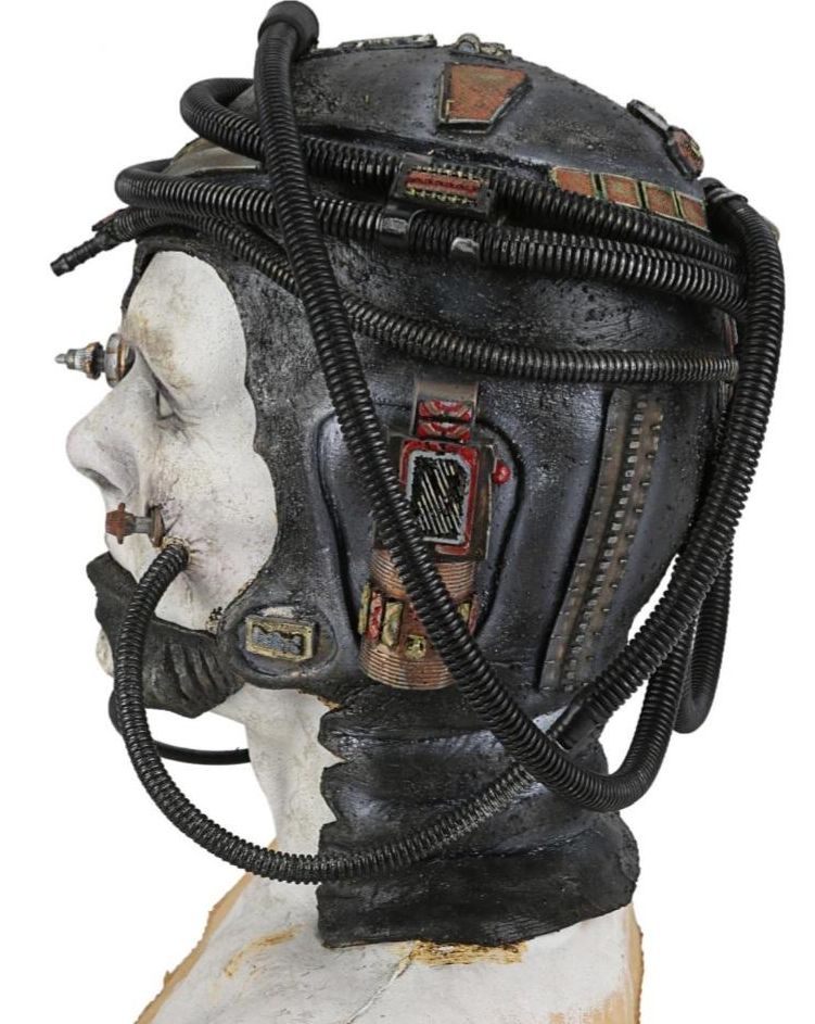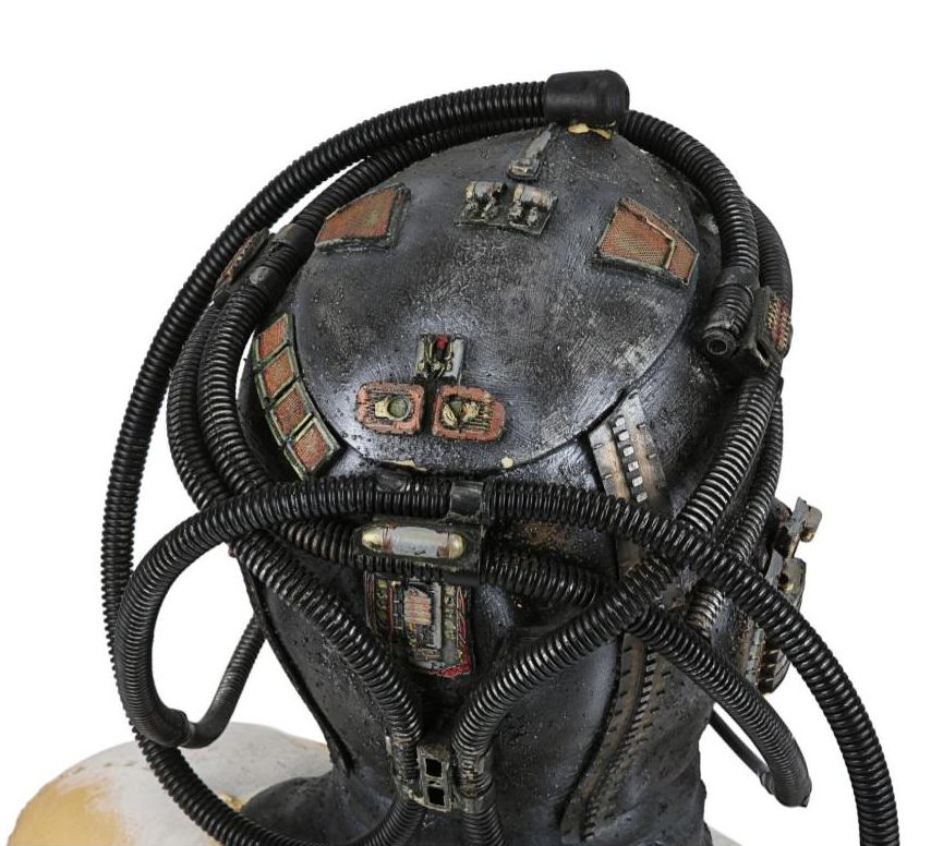 A bust modelled on the Borg, from the sci-fi television series Star Trek: The Next Generation. The Borg were recurring antagonists on the show, cybernetic organisms linked to a hive mind "The Collective" who sought to forcibly assimilate other species. This bust was produced from the original production molds for the exhibition Star Trek: Federation Science, which toured around the United States and Europe during the 1990s and early 2000s.