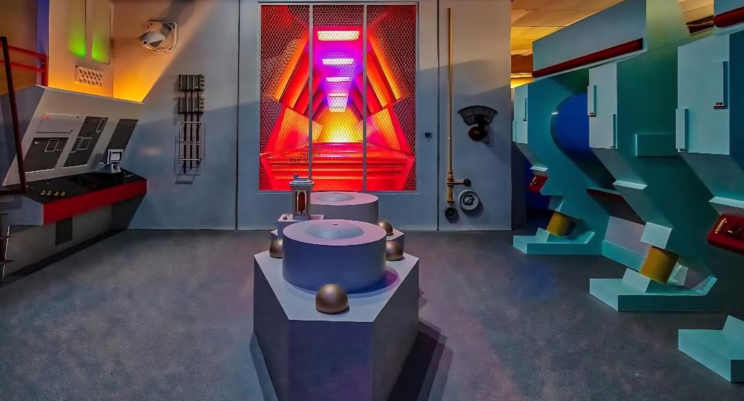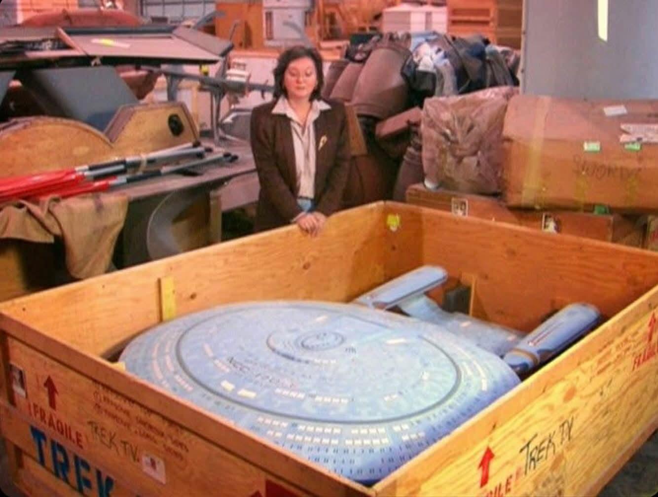 Ladder to the Stars: Talos IV Surface Set Construction with Aluminum Foil This shot, digitized from a reference film owned by Matt Jefferies, shows the construction of the set used for the filming of the original 1964 pilot "The Cage." Visible are the rock outcropping and elevator components, a large piece of aluminum foil for surface treatment, the rocks which are being hoisted and