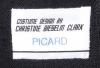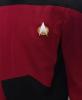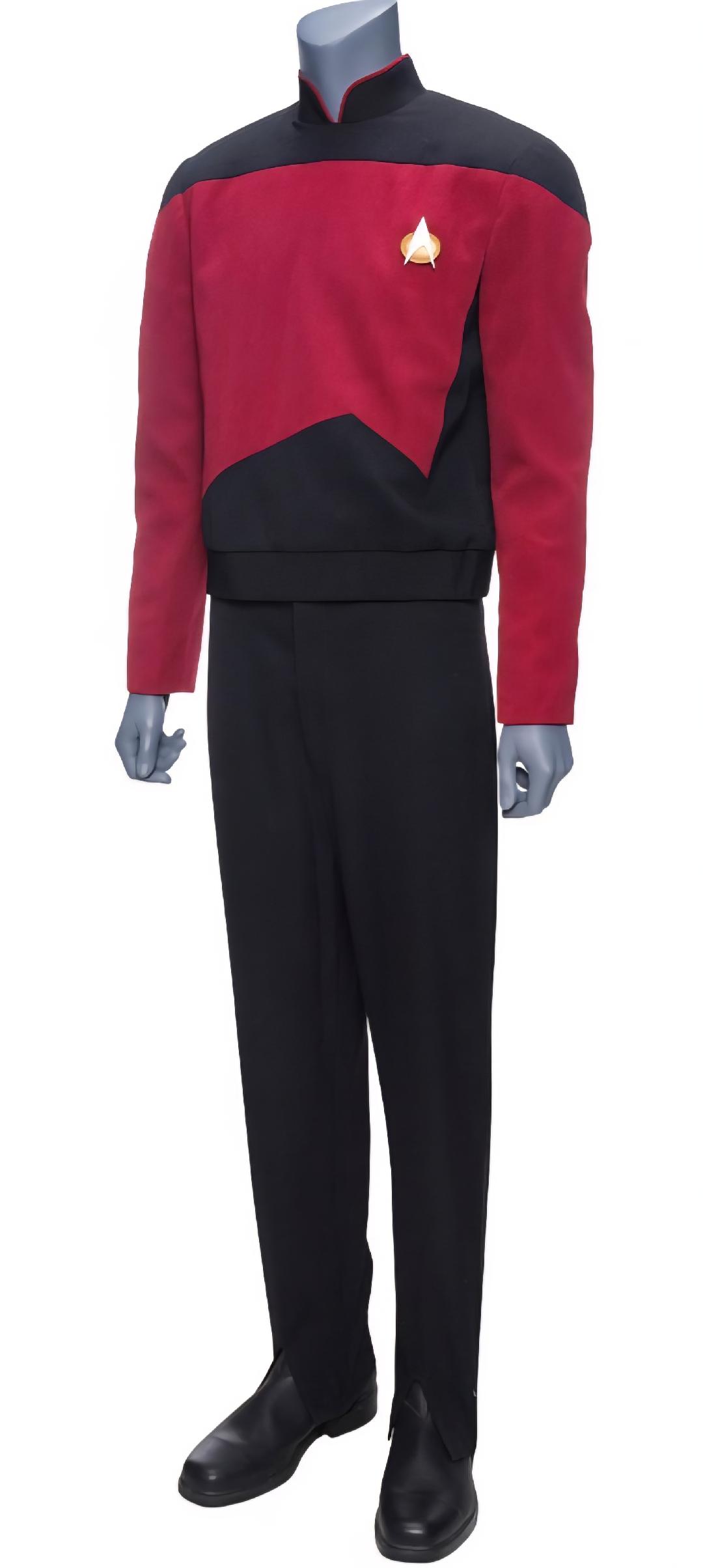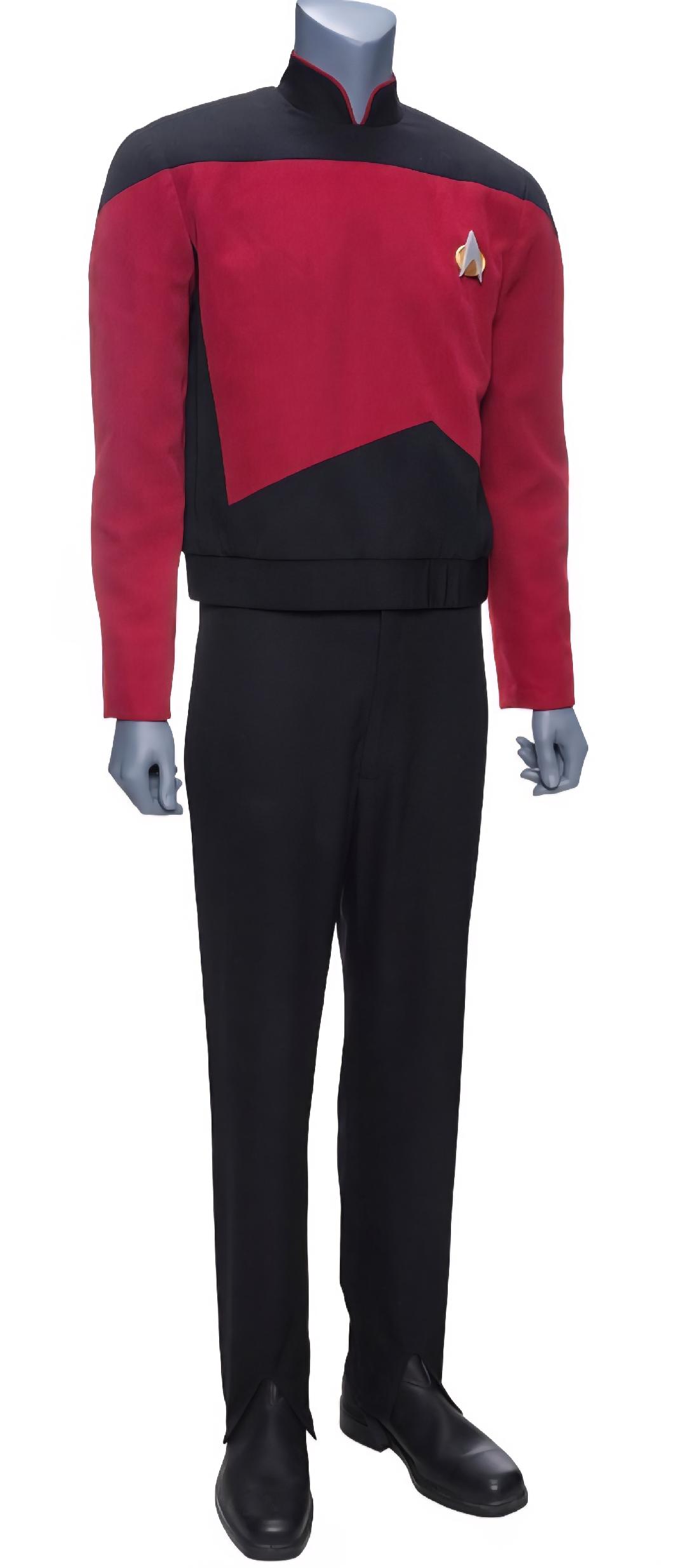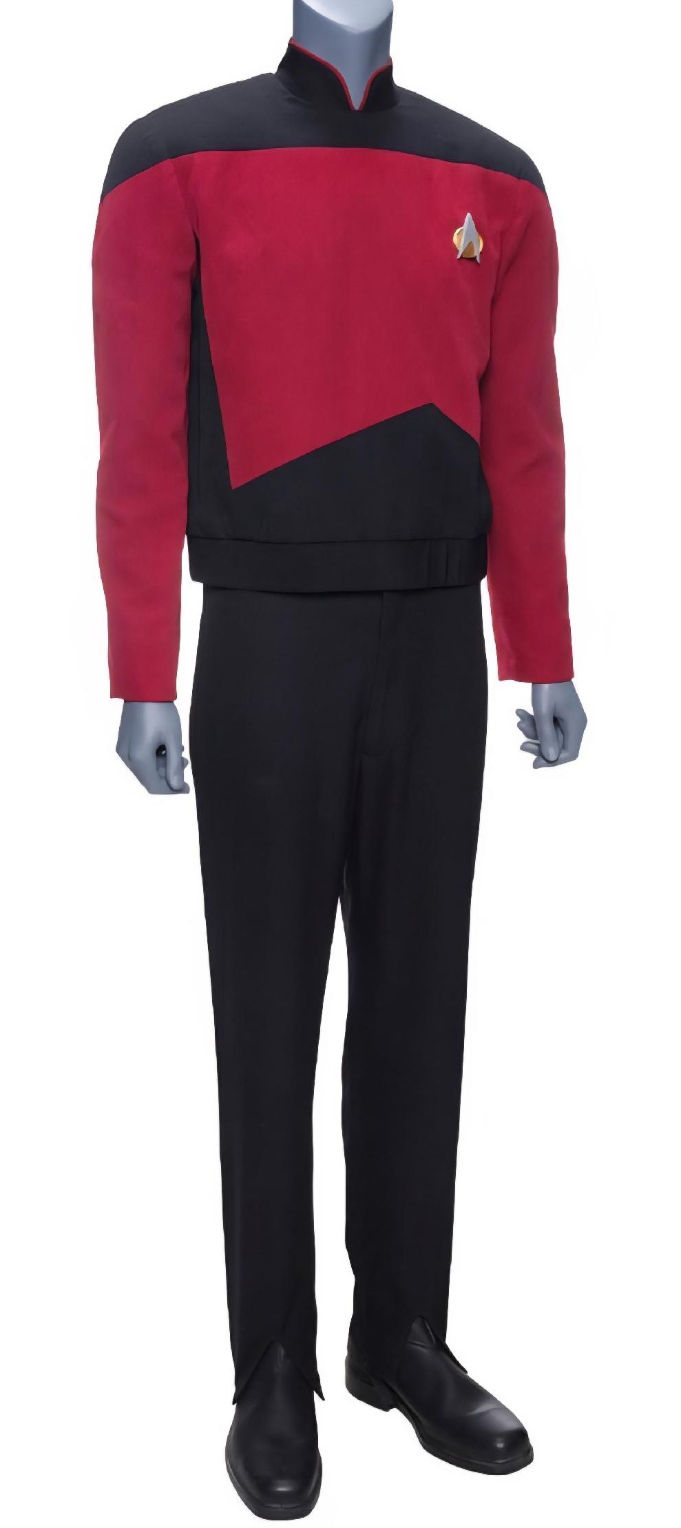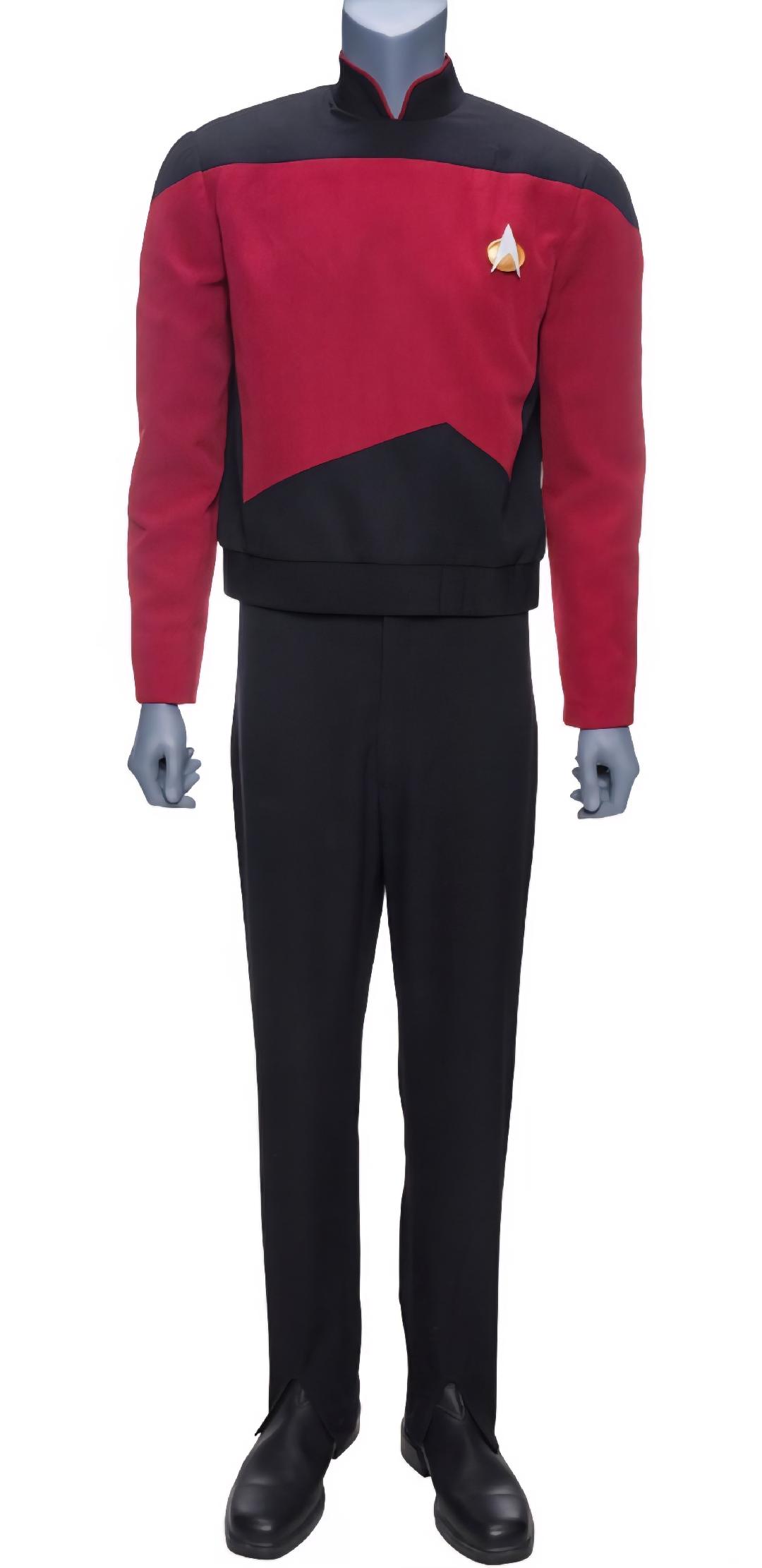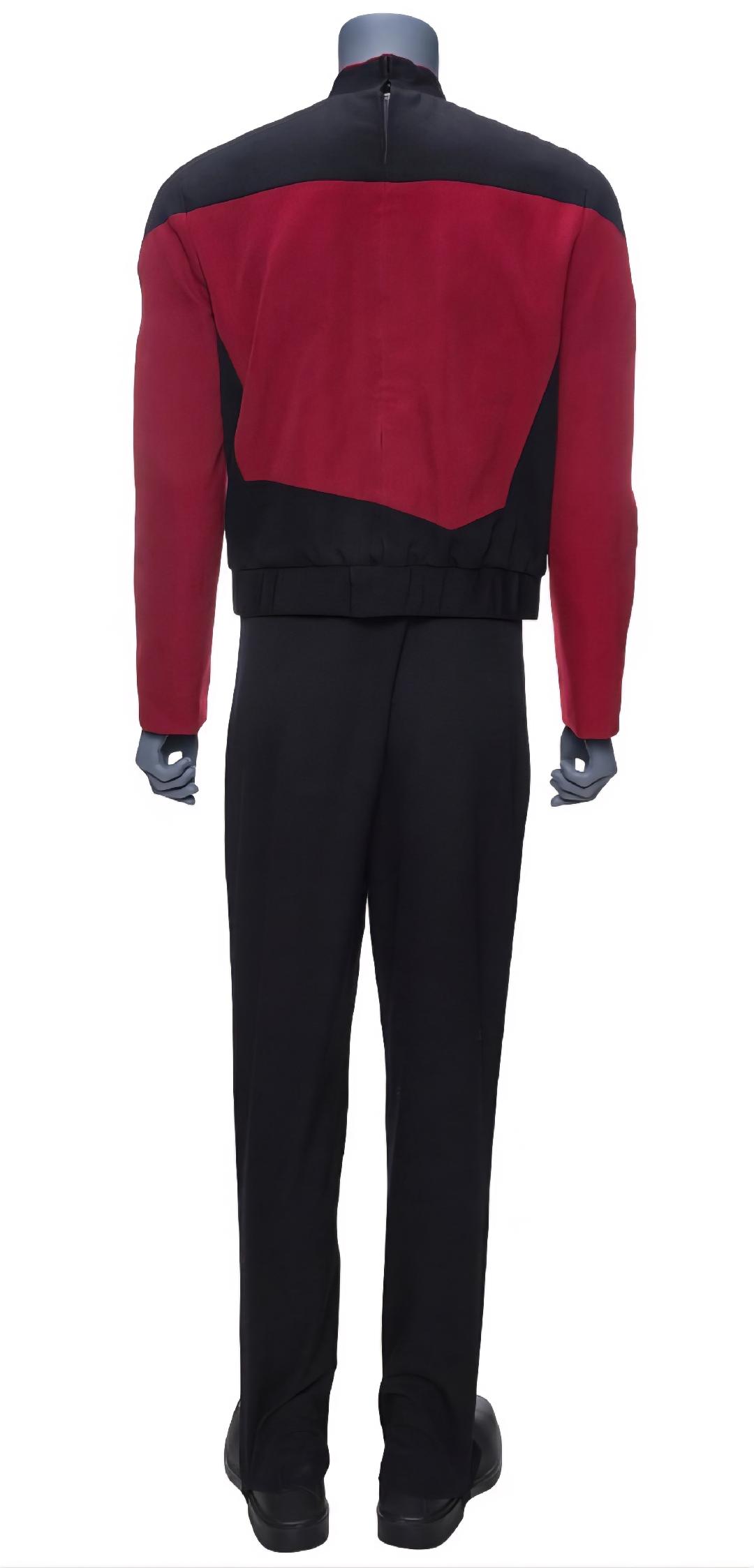 This costume, meant to replicate the 2360s era uniform that Picard wore throughout Star Trek: The Next Generation, consists of a black and red heavy weight Spandex uniform top marked "Picard" with a fastening strip on the chest for attaching a combadge; a matching pair of black pants, also marked "Picard" with elastic suspenders and boot stirrups; a pair of leather boots; and a metal pin backed replica of the 2360s combadge, which was cast from a mold created from screen-used props and hand fabricated by Star Trek: Picard prop shop supervisor Joe Martinez. Also included are three paper production tags, designating this costume as "stunt." The boots exhibit minor scuffing from use.