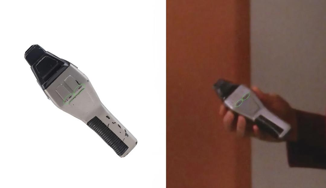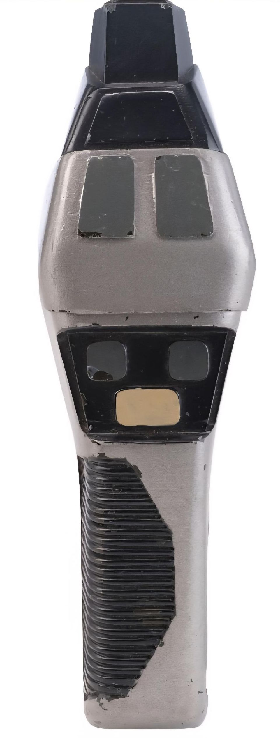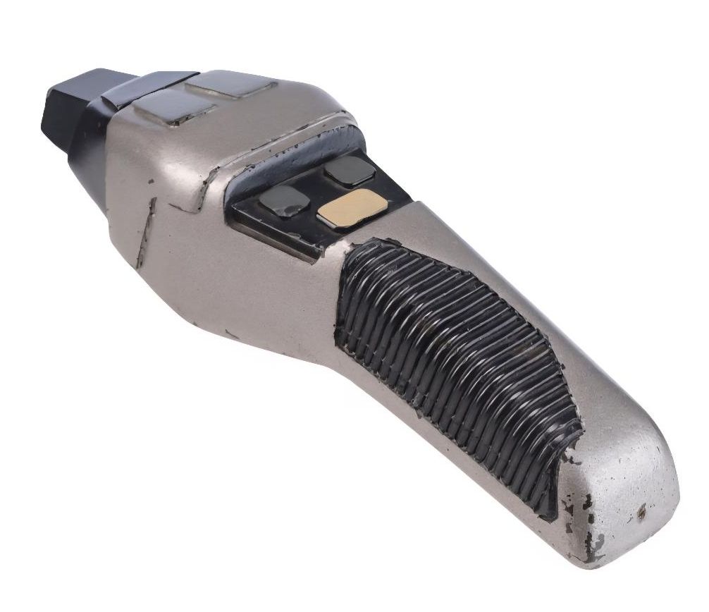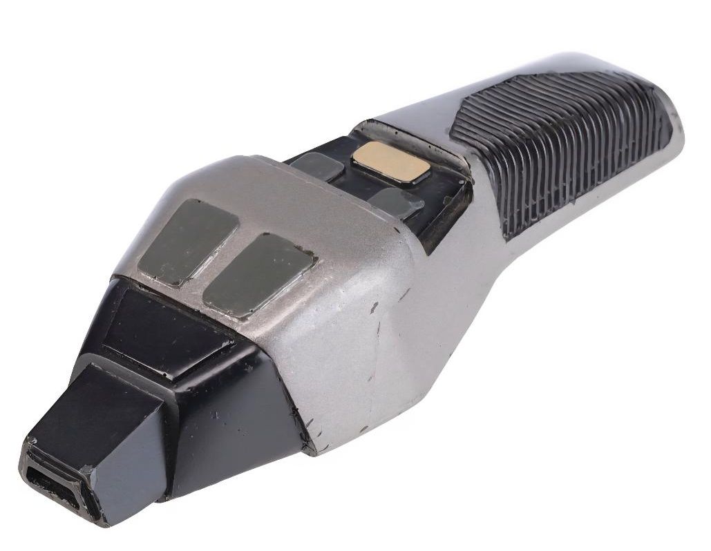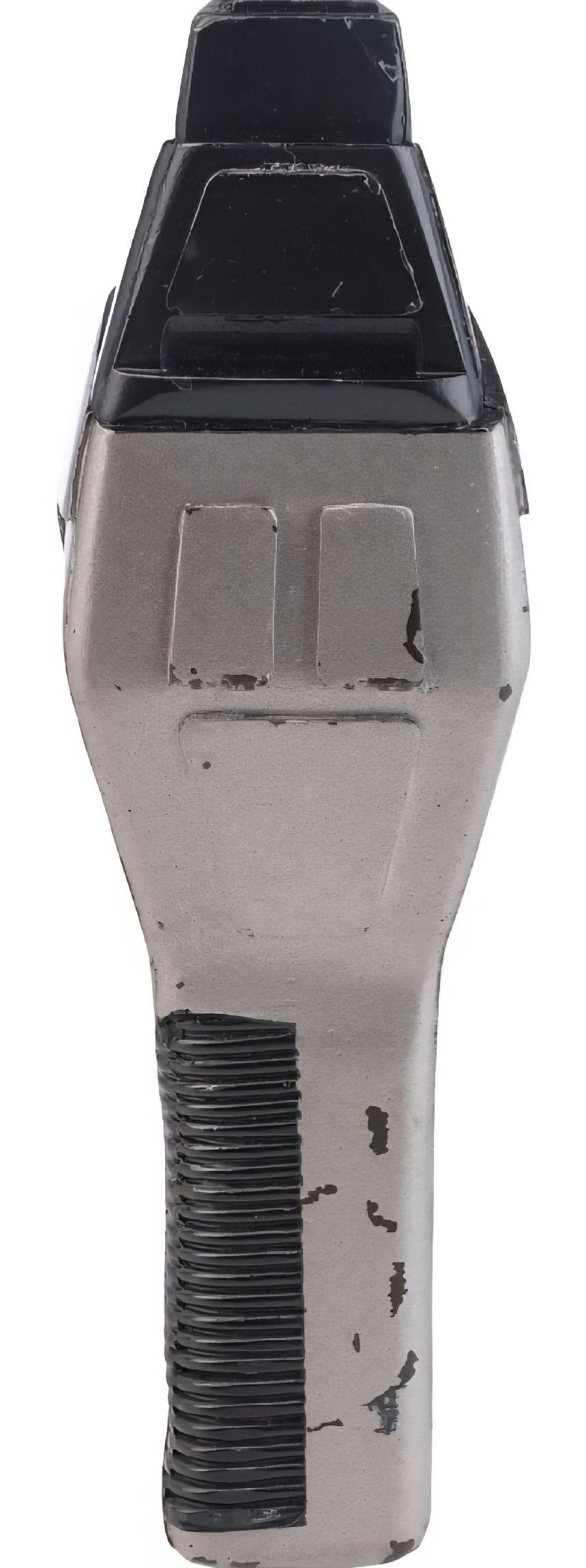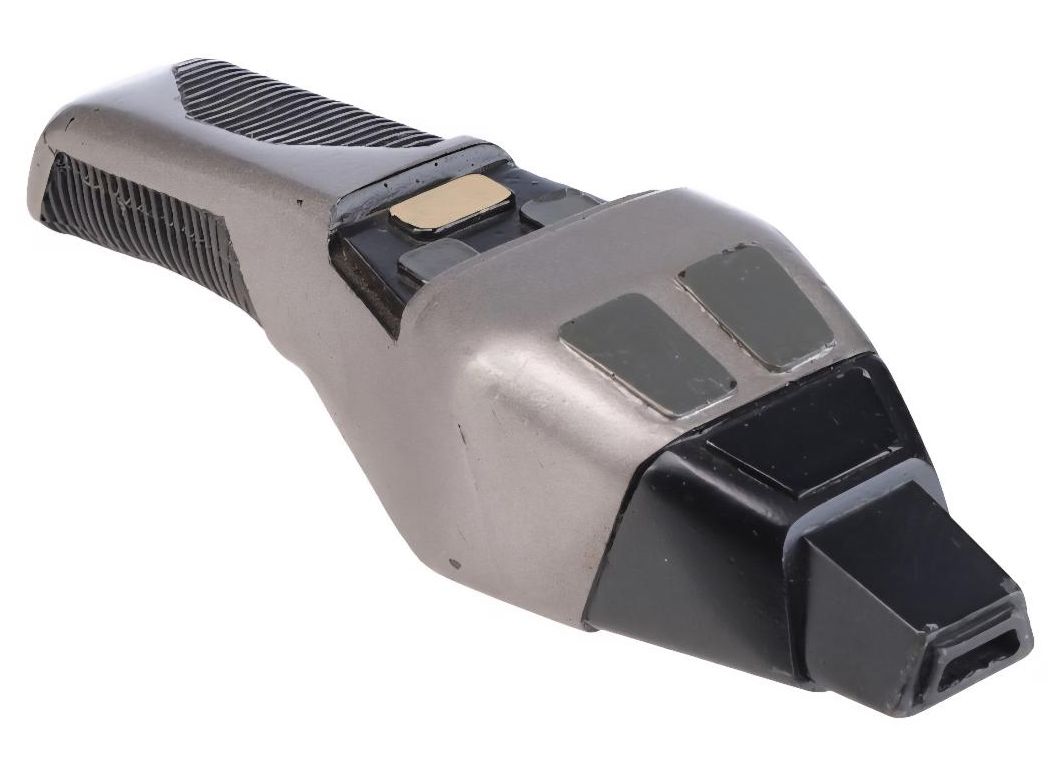 A screen-matched 2366 Type-2 phaser from Gene Roddenberry's Star Trek franchise. First introduced in Season 3 of Star Trek: The Next Generation and later used in Deep Space Nine and Voyager, the standard issue 2366 phaser variant wielded by many Starfleet officers featured a sharper angular design than those that came before and after it, earning it the nickname "Cobra Head." Phasers of this style notable for the gray paint finish on its phaser setting selector buttons appeared in the Season 6 TNG episode "Timescape." This phaser screen-matches to the scuffs and chipped paint on the sides and end.