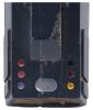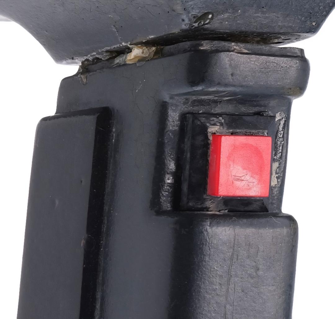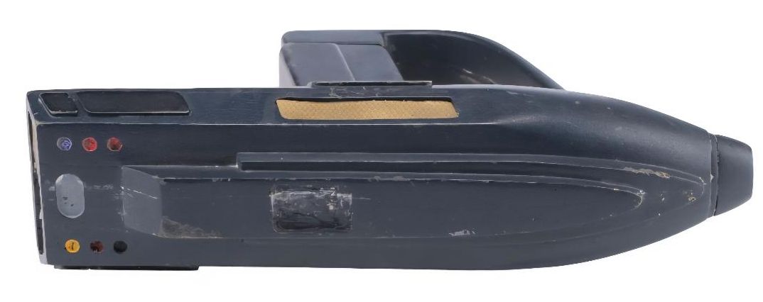 This static otherworldly pistol is cast from resin with a multicolor button array hand-painted on top, a trigger button inset on the curved handgrip, and diamond shaped gold-color grating inset on both sides of the barrel. Also included is an acrylic display stand with a Starfleet insignia shaped base. The disruptor exhibits fractures and splits on the butt and trigger guard, paint flaking, and adhesive residue throughout from production use and age. Dimensions: 9.5" x 2.75" x 7" ( 24.25 cm x 7 cm x 18 cm ).