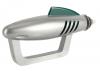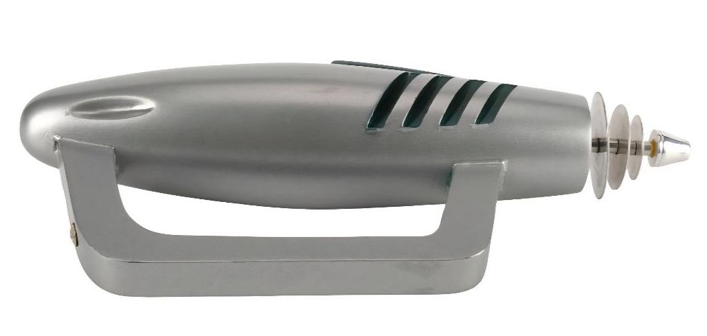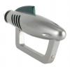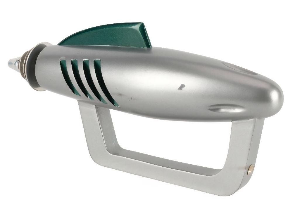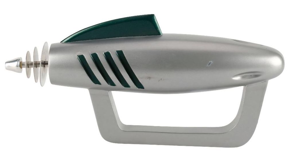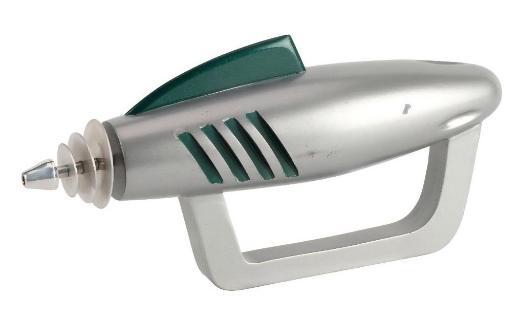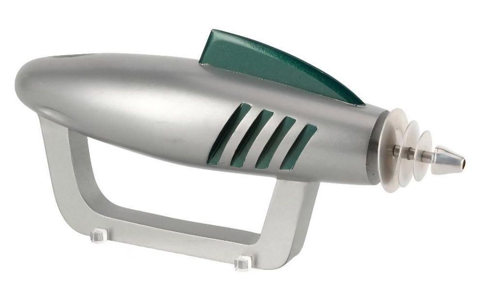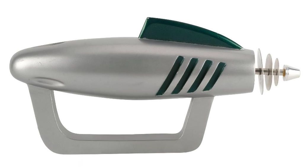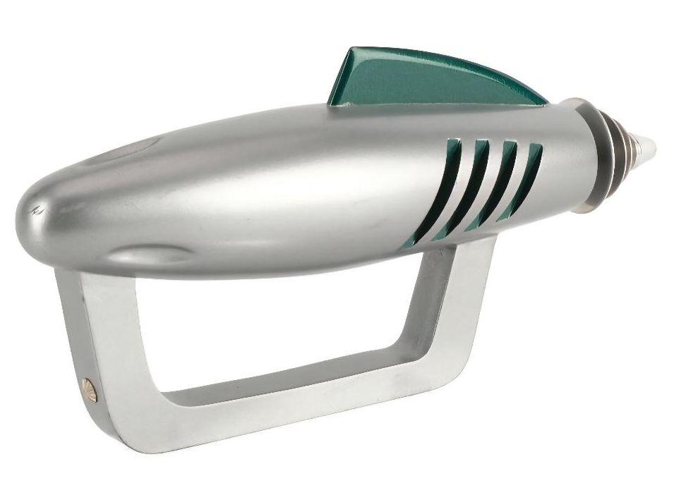 This custom raygun was designed in homage to the style of alien weaponry seen in such classic science-fiction serials as Buck Rogers and Flash Gordon and built for the episode by HMS Creative Productions. It features a cast resin body painted to appear metallic with a top fin and green striping on each side, and a machined aluminum tip on the front. Also included is an acrylic display stand with a Starfleet insignia-shaped base. The raygun exhibits scuffing to its finish and some chipping along the body from production. Dimensions: 10" x 2" x 4.75" ( 25.5 cm x 5 cm x 12.25 cm ).