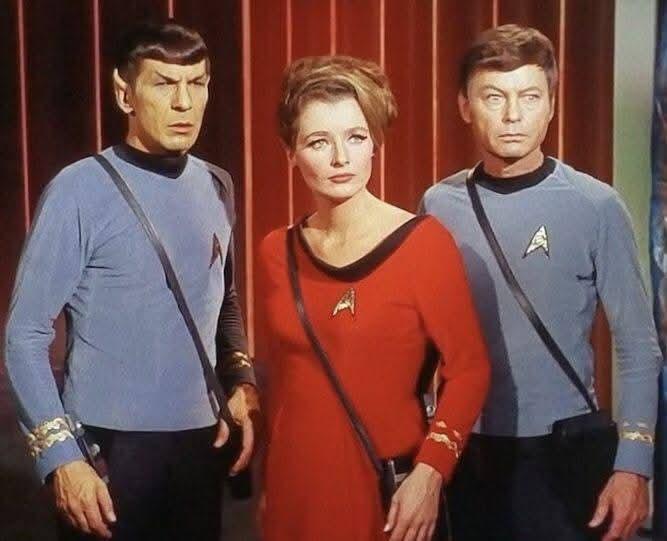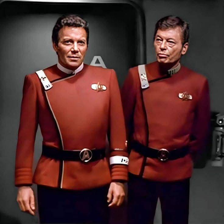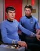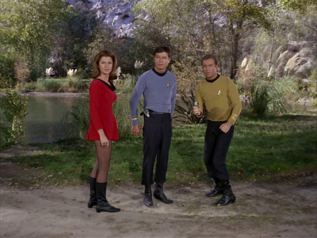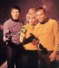 The show is set in the Milky Way galaxy, c. 2266â€"2269. The ship and crew are led by Captain James T. Kirk ( William Shatner ), First Officer and Science Officer Spock ( Leonard Nimoy ) and Chief Medical Officer Leonard H. "Bones" McCoy ( DeForest Kelley ). Shatner's voice-over introduction during each episode's opening credits stated the starship's purpose: