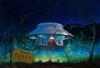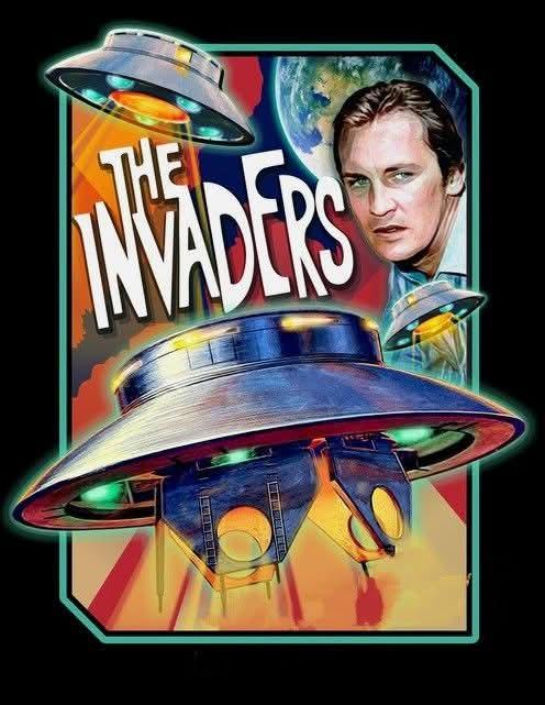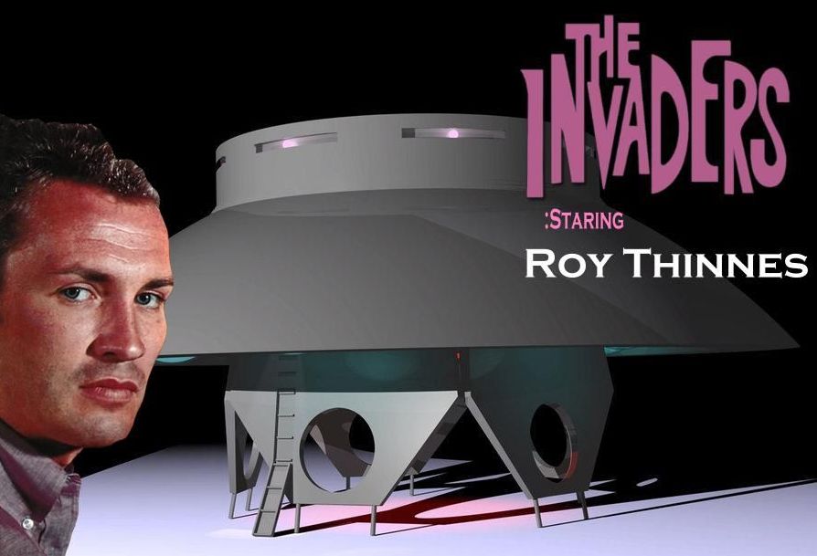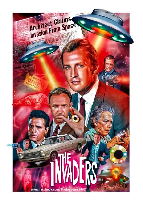 A beam emitting flying saucer imperils David Vincent ( Roy Thinnes ) in these fan art from the 1967-68 alien invasion sci-fi TV series. |
