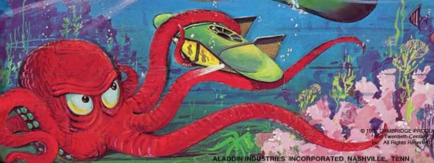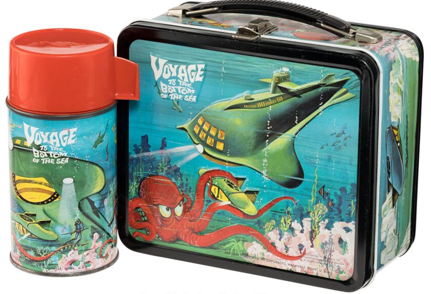 Issued by Aladdin Industries in 1967. A black metal box with the Seaview and Flying Sub being attacked on one side. The other side pictures, Nelson & Crane observing a sea monster. The box also includes a thermos bottle with artwork images.Value: $400.