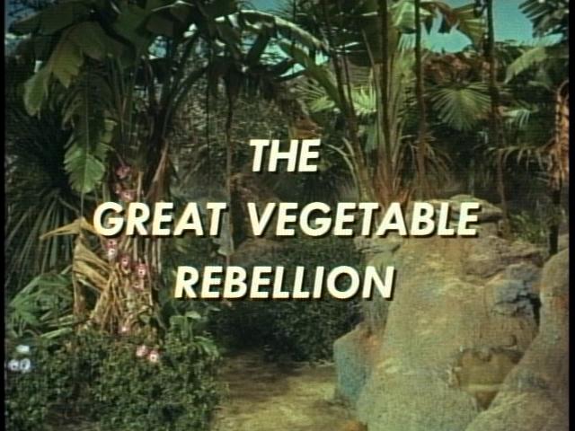John, Maureen, Don and Penny are. meanwhile, trapped in Tybo's hothouse, another first draft script leftover. Trapped inside by a forcefield they are forced to listen to Tybo's plans to transform all of them into living human vegetables! After the carrot-man departs Willoughby encounters the other Robinsons for the first time and helps them formulate an escape plan. Below the hothouse is another room that controls the temperature above, among other things. As Don and John begin to search for the trapdoor Penny faints and begins to take root! Maureen is afraid to move her for fear of injury. The metal door on the floor is located and off go Robinson and West, tramping down stairs which in reality did not exist. In the same interview June revealed that Williams and Goddard had to pretend to walk down a flight of stairs and walk offscreen, hidden by the huge metal door. Once in the hothouse basement (another set) the men mistakenly turn the wrong valve and are sprayed by off-screen fire extinguishers...you can even hear the "whoosh!" "Now I know the difference between a high-pressure valve and a shut-off valve!" exclaims John.