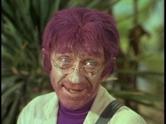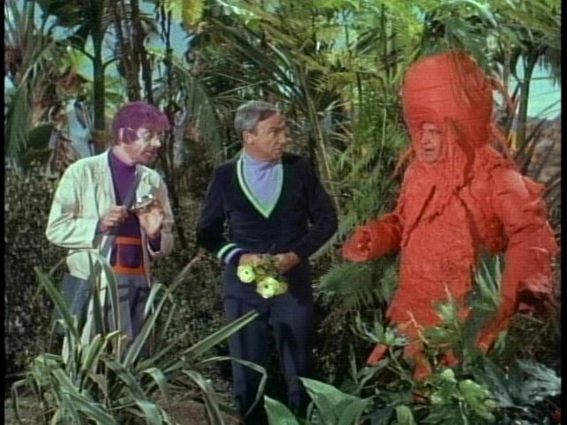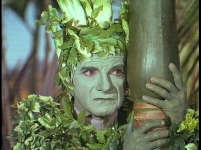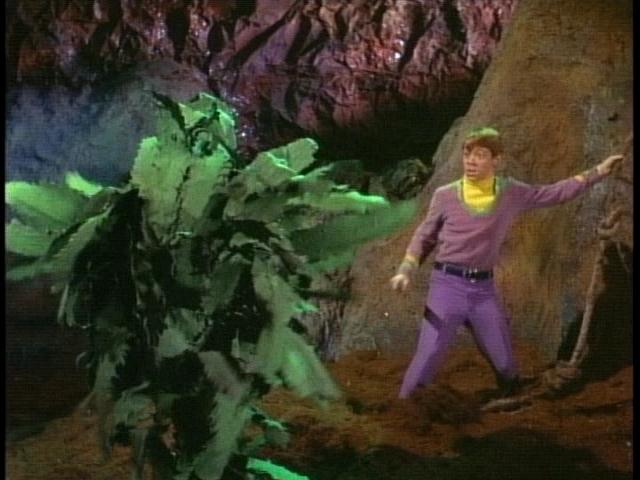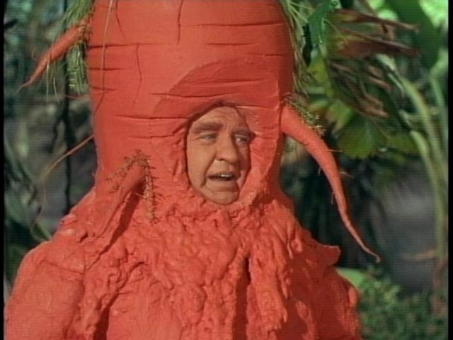 Scissors in hand, the good Doctor lands and begins to snip away at the various plants, at first unaware of their cries of pain (an oft-repeated legend states that during rehearsal, people around the set were recruited to provide the anguished cries of the dying plants in an attempt to aid the actors, but what resulted instead were gales of laughter from the cast, especially Williams and Lockhart. Irwin was reported so incensed he suspended the two from the next two episodes. Neither actor minded much as they were still paid full salary for Fugitives in Space and Space Beauty). The plants' cries alert Tybo, the seven-foot human-faced carrot-man and apparent ruler of this part of the planet. Tybo was portrayed by the late Stanley Adams, star of episodes of Star Trek, Twilight Zone, and The Night Stalker. I was fortunate enough to interview Adams shortly before his untimely death (more on that later). Tybo accuses Smith of murder and as the cowardly Doctor attempts to flee he is halted by Willoughby (portrayed by the late James Milhollin, another Twilight Zone alumnus), a human/plant hybrid with purple hair and a head of lettuce for a heart! The evil carrot decides to spare Dr. Smith's life as he has more sinister plans for the good Doctor-Smith will become another of Tybo's half-human, half-vegetable creations!