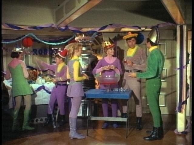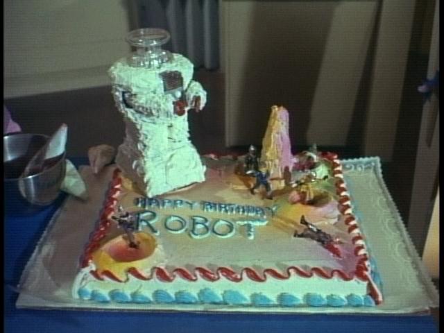 As the spaceship, with Don and John at the helm as usual, orbits the planet, on the lower deck a party is about to begin. Outside the lab a table is set up (why not on the galley table? Perhaps it was set too far back for the camera shot the director needed) with a most unusual cake, topped by a Remco robot covered in vanilla frosting save his bubble, arms and chestplate, as this is a party for the mechanical man's birthday. The party was the idea of young Will, currently sporting a black eye caused when he was struck by the robot's present falling off the shelf in his room. One person on board is less than happy with the idea of a party-Dr. Smith, who has no present as of yet but has an absurd idea of what to get and how to get it. Robinson has already informed Smith the planet is not populated by any animals-only plants-so the Doctor decides to fly the Space Pod down to the plant planet, grab some birthday present posies and get the robot to "swear undying loyalty" as the end result.