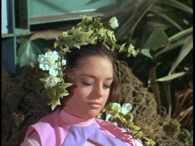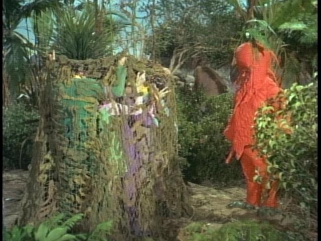 Once landed, the Robinsons arm themselves with previously-unseen machetes, disembark, and leave Will and Judy onboard to keep an eye on the ship while John and the others search for the missing Dr. Smith. Accompanied by cries from the screaming shrubbery they hack their way through the jungle and are captured by Tybo as well, prisoners in a filthy WW II surplus net rescued from an earlier Fox film. The net was supposed to capture the Robinsons and lift them off the ground but to save money and time it was dropped on them instead. June Lockhart once remarked in an interview how disgusting the net was and how no one wanted to let it touch them.