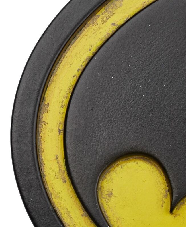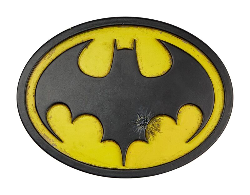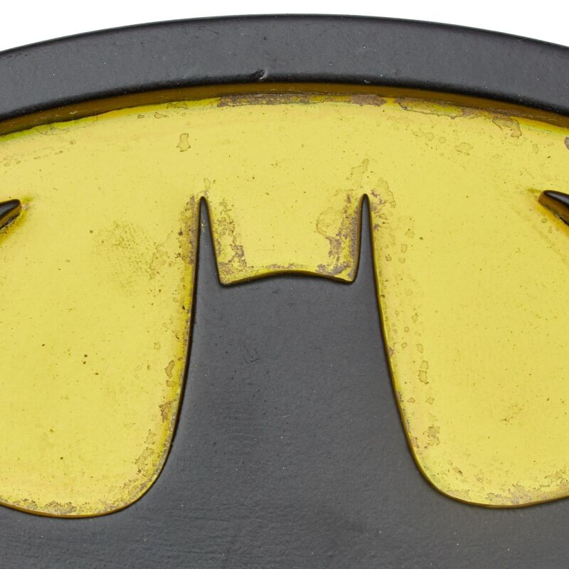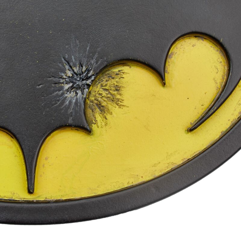 Made of resin and painted in black and yellow, this Bat Symbol features a small crater to show where a bullet has bounced off during battle. The numbers "02" are written and underlined on the back in red marker. Aged adhesive is also still present on the back. A cultural and box office sensation when it was released, Batman is looked upon today as the true start of the modern superhero film.