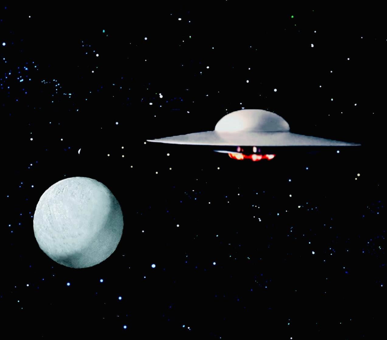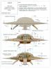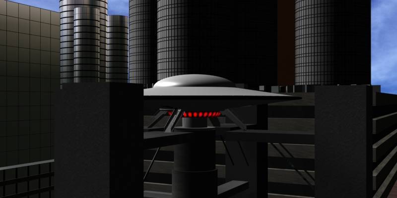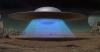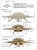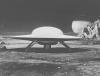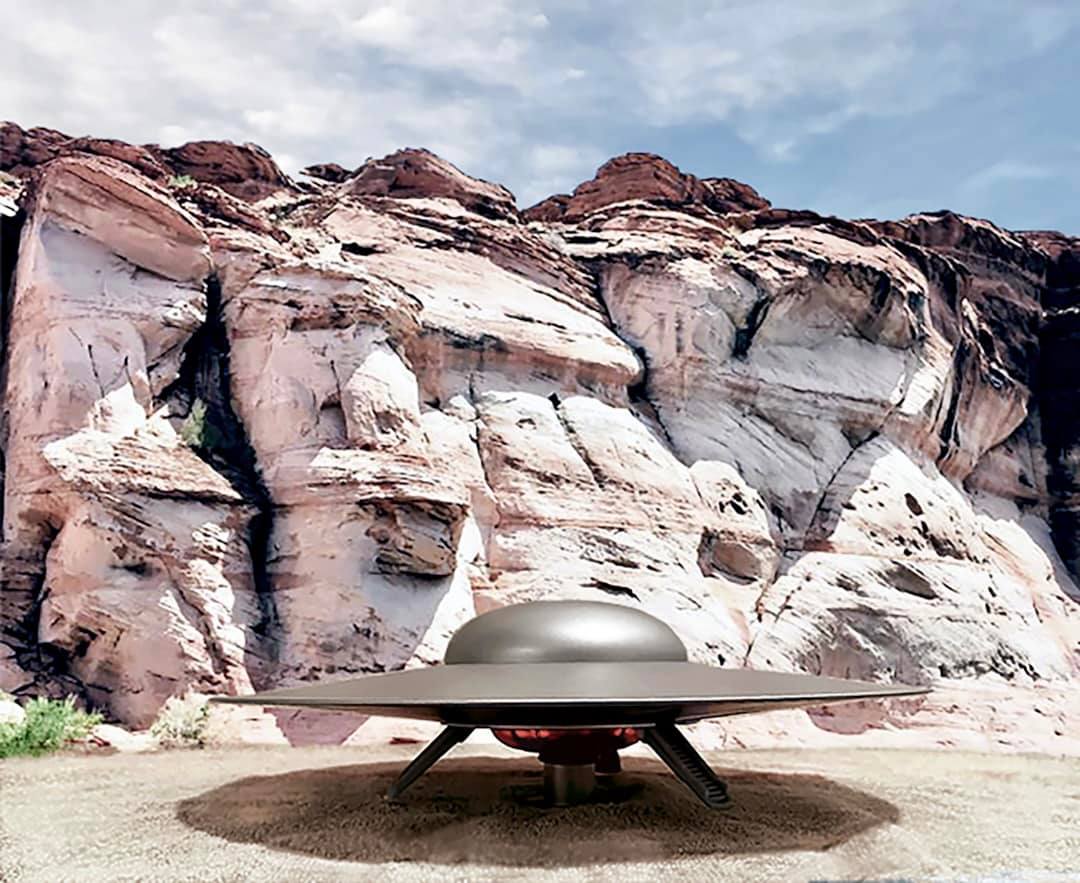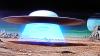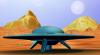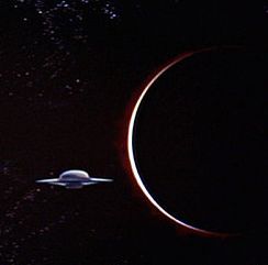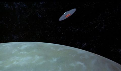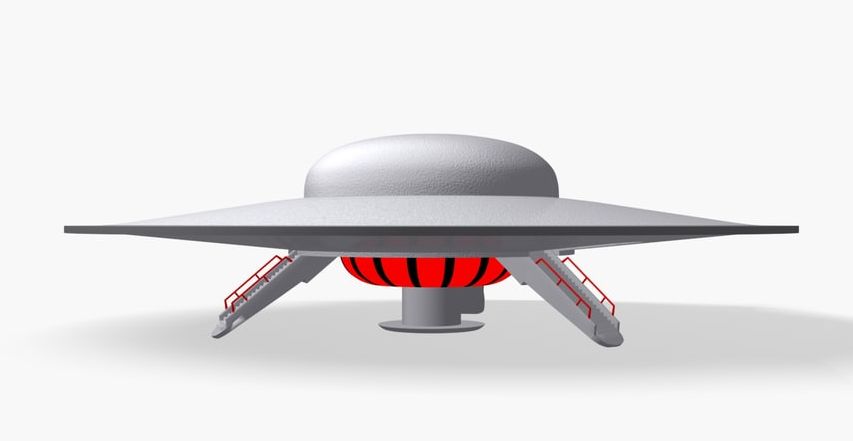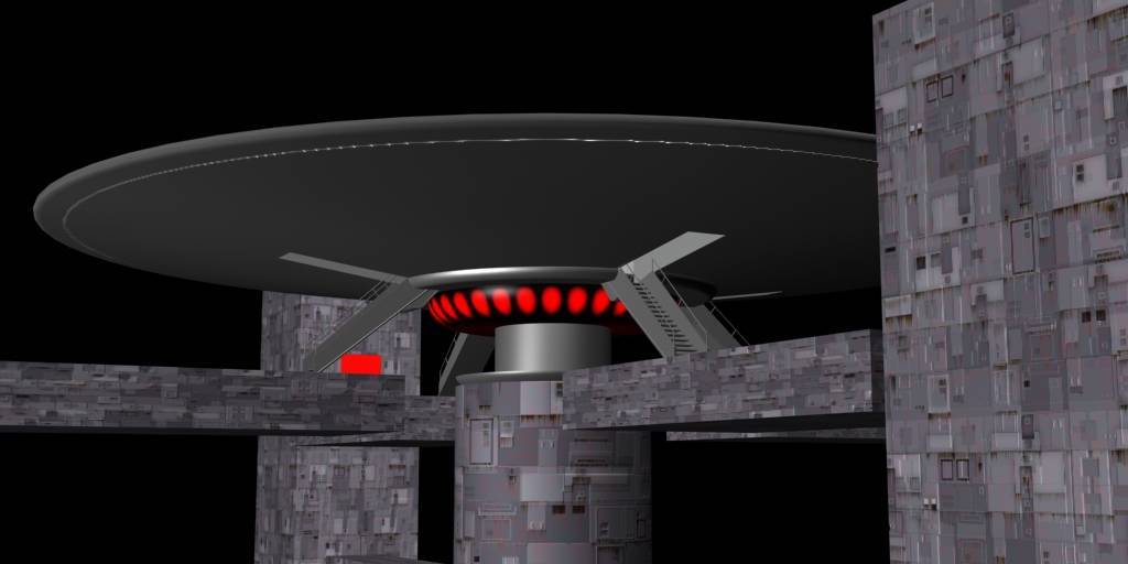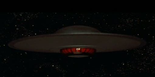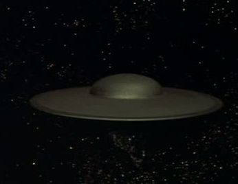 very shallow cylinder of about the same diameter, and a somewhat smaller dome that ostensibly houses the starship's faster-than-light drive engine and central gyroscopic landing pedestal. The precise contours and proportions differ slightly between the saucer's shooting miniatures, full-size sets, and matte paintings used in the film. On landing, the saucer's gangway and two conveyor-loading ramps swing down at an angle from the underside hull, near the edge of the lower lens shape.