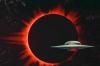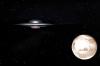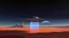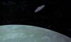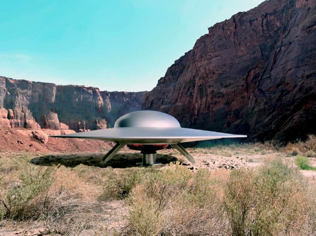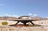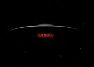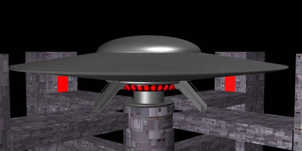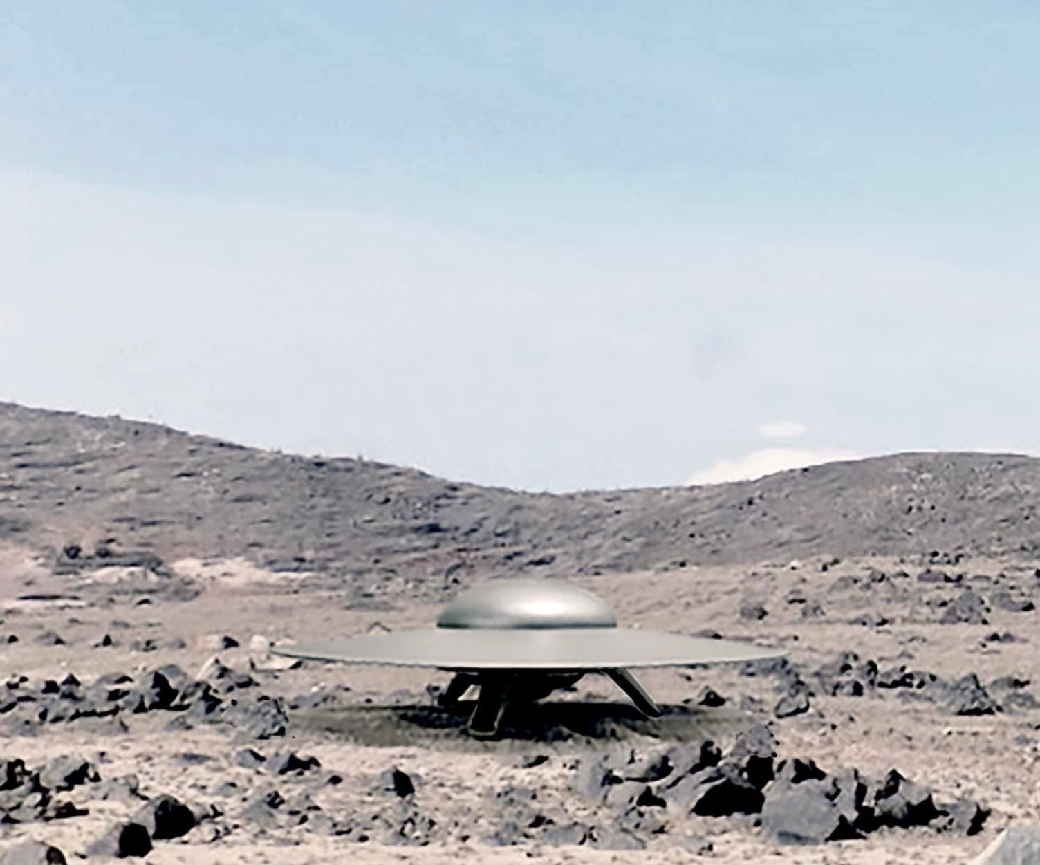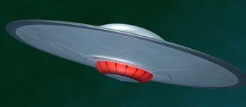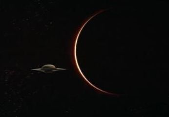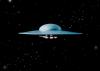 very shallow cylinder of about the same diameter, and a somewhat smaller dome that ostensibly houses the starship's faster-than-light drive engine and central gyroscopic landing pedestal. The precise contours and proportions differ slightly between the saucer's shooting miniatures, full-size sets, and matte paintings used in the film. On landing, the saucer's gangway and two conveyor-loading ramps swing down at an angle from the underside hull, near the edge of the lower lens shape.