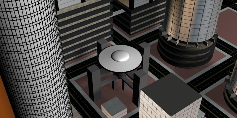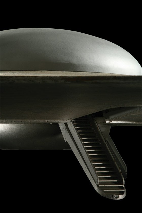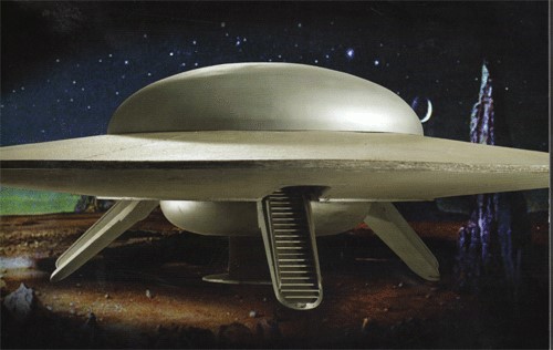 in diameter, and costing an estimated total of $20,000. The largest miniature, constructed of wood, steel, and fiberglass, which contained the internal motors for the gangway, conveyor ramps, central landing pedestal, and glowing red-neon light engine,