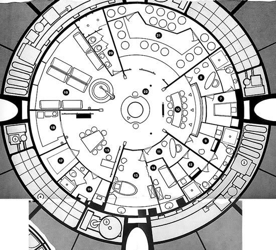 The film's blueprints for the command deck show it to have a central circular "navigation center" with a transparent globe centered on a small model of the starship. Around this central space are a number of wedge-shaped rooms, including: