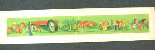 A piece of original hand painted artwork for Aladdin's 1968 Land of the Giants lunch box. It is done on heavy weight illustration board. Extremely bright and unfaded and very detailed, it is dated 11/11/68. It measures 10 x 46. It is really long, and hard to get a photo of the entire thing. It is in 2 pieces, divided in the center here the spaceship is. Artist is Elmer Lehnhardt. Land of the Giants is probably Elmers most famous lunch box piece. It is said that on the lunch box the giant is actually a self portrait? ( Rumors had it, the Giant's was Producer / Creator., Irwin Allen? )
