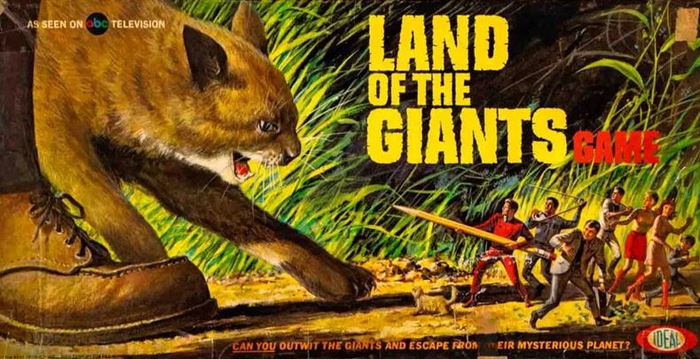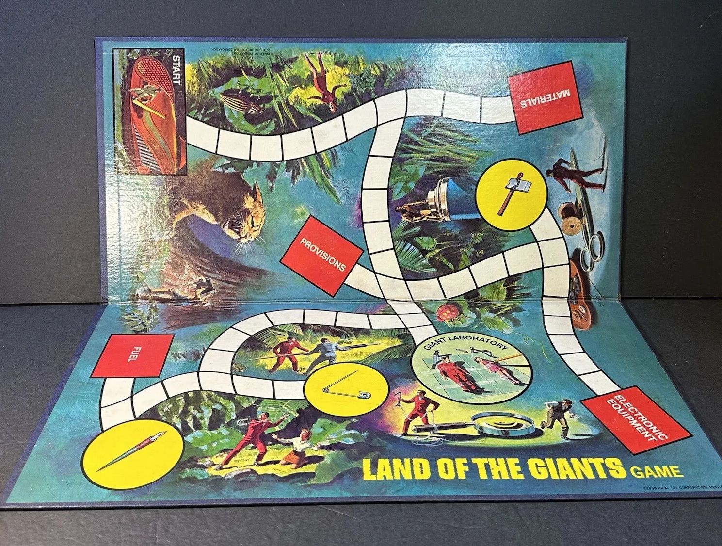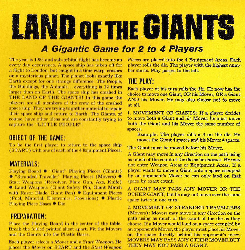 This game is made in 1968 by Ideal Toy Corp. This was a TV series on ABC by Kent Productions 20th Century Fox Film Company. Can you outwit the Giants and escape from their mysterious planet? A Gigantic Game for 2 to 4 players. The first player who returns with 1 of each of the 4 equipment pieces to the spaceship wins the game.