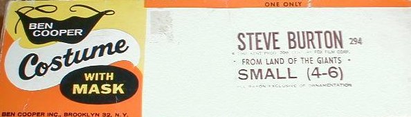Issued by Ben Cooper in 1968. There were ( 5 ) Halloween costumes released on "Land of the Giants". The Steve Burton, and Dan Erikson's" are the rarest of the set. "I paid $4,700.00 for the complete set of ( 5 ) near mint with boxes. I may be the only collector out there, that has the complete set?" This Gary Conway - "Steve Burton" costume is indeed the rarest of the 5 costumes released from the original series. The mask and costume is excellent, and great detail and color. I have yet seen another, Steve Burton Halloween costume anywhere.