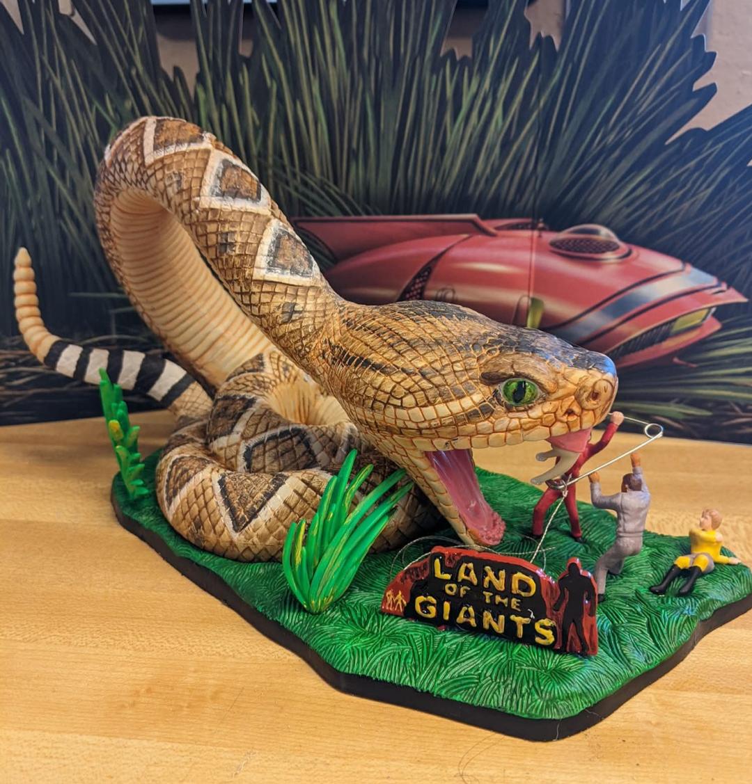 The beloved "Snake" model kit ( #7152 ) from Land of the Giant's, manufactured by Polar Lights and reissued in 2002 from the original Aurora molds. This dynamic styrene diorama measures roughly 10" wide, 5" high and 4.5" deep and comes fully assembled and meticulously hand-painted by famed kitbuilder Bill Craft of Craftbeast Designs.