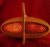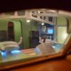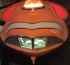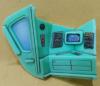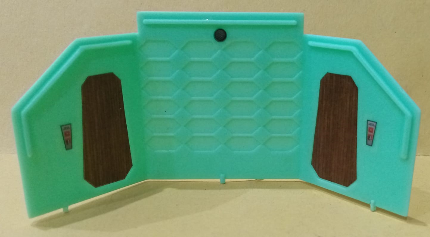 The kit is comprised of around forty parts, molded in orange ( Exterior ), a vomitous green ( Interior ) and clear ( Windows and base ). ( There is another issue of the kit in which all parts are either white or clear you can see which you're getting through a small window in the bottom of the box ). There is not a lot of detail present but then, there wasn't a lot on the original. The interior parts bulkheads, flooring, chairs and instrument clusters are crisp enough. So are the grilles on the exterior. As on the Aurora kit, the company logo and striping are raised from the surface to make them "easier" to paint. Most modelers these days would no doubt prefer decals, but this is a faithful replica of a 30 year old kit so we get raised markings. Also included are three surprisingly nice figures. Their size is what leads me to conclude the ship is around 1/72 scale.