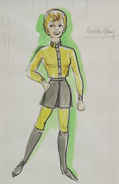 Original costume sketch for ( Heather Young ) Betty Hamilton as a Spindrift flight attendant for Land of the Giants. ( ABC-TV, 1968-70 ) Costume design sketch featuring Spindrift flight attendant "Betty Hamilton" in a yellow & gray uniform with high boots from Land of The Giants. A Irwin Allen series about an alternate earth inhabited by giants. While some black lines are photocopied, the costume designer hand-inked in other black lines and hand-applied colors to the drawing as the costume was
