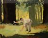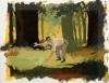 10" x 13" on 4-ply artist board, glue tipped to a mat measuring 17" x 21" and hinged with transparent mylar overlay. A second artwork of oil with varnish measuring 15" x 20" indented to 12" x 16" on 4-ply artist board, glued tipped to a mat measuring 17" x 21" and hinged with transparent mylar overlay depicts Fitzhugh foraging for currency in the woods. A third artwork of Barry Lockridge in oil with varnish measuring 16" x 19" indented with masking to 10" x 13" on 4-ply artist board, glue tipped to a mat measuring 17" x 21" and hinged with transparent mylar overlay. Actual artwork reproduced on pages 298-301 of "The Fantasy Worlds of Irwin Allen" by Jeff Bond, Creature Features 2019.