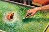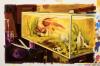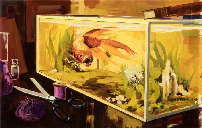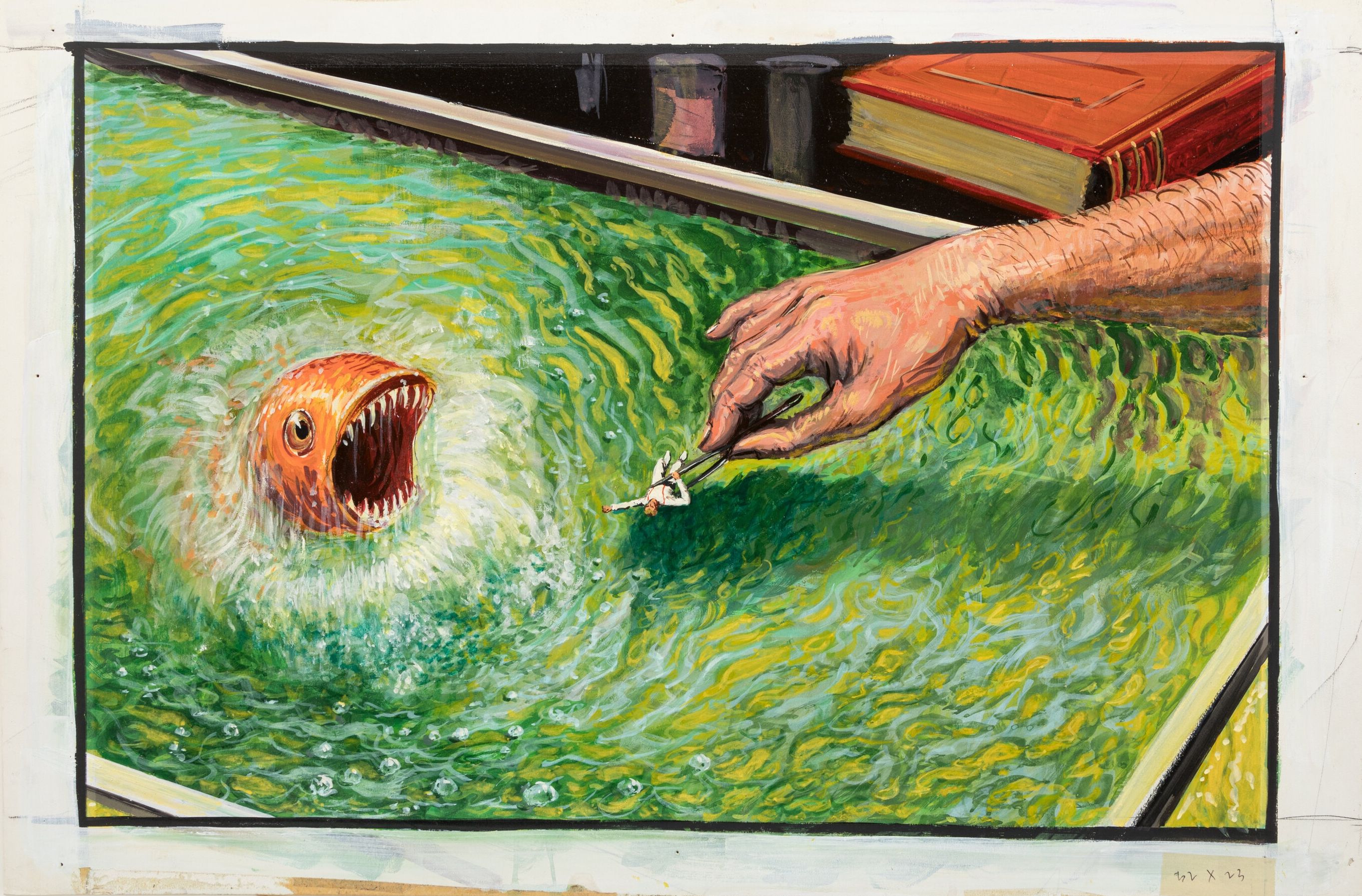 the Land of the Giants in oil paint with varnish, measuring 20" x 30" indented to 17" x 26" on 4-ply artist board, glue tipped to a mat measuring 24" x 32" and hinged with transparent mylar overlay. The pre-production artwork depicts a "Spindrift" crew member in a fish tank menaced by a giant goldfish. A second artwork in oil paint with varnish, indented to 17" x 26", measuring 20" x 30" on 4-ply artist board, glue tipped to a mat measuring 22" x 32" and hinged with transparent mylar overlay, depicts the crew member about to be fed to the voracious goldfish by a giant hand. Actual artwork reproduced on pages 298-301 of "The Fantasy Worlds of Irwin Allen" by Jeff Bond, Creature Features 2019.
