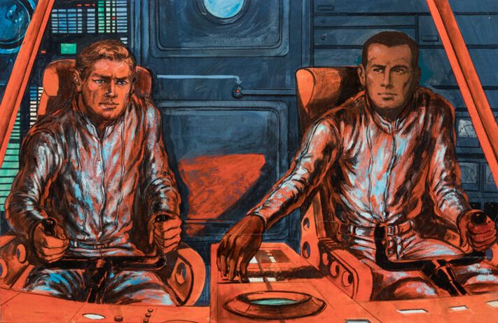( Irwin Allen Productions, 1968-1970 ). Vintage original concept art from The Land of the Giants of the pilots in the cockpit of "Spindrift" navigating space, in oil paint, tempera, and graphite with varnish, indented with masking to 17" x 26", measuring