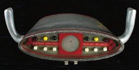 The original Spindrift control yoke from Land of the Giants. ( ABC-TV, 1968-70 ) This scratch-built prop is fabricated in wood, plastic and crude 1960's era electronics ( Which once illuminated the faceplate ). Hand-set lettering on the faceplate reads "Systems Control - Nuclear Balance". The central control yoke of the Spindrift Supersonic Transport Vehicle, this prop is seen prominently in the series. Comes with the original hand drawn schematic designs for the yoke.