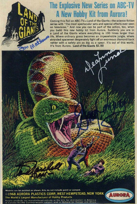 Four original cast members Don Matheson, Gary Conway, Deanna Lund, and Don Marshall signed an original 7 x 9 Aurora diorama model kit advertisement.Value: $200.