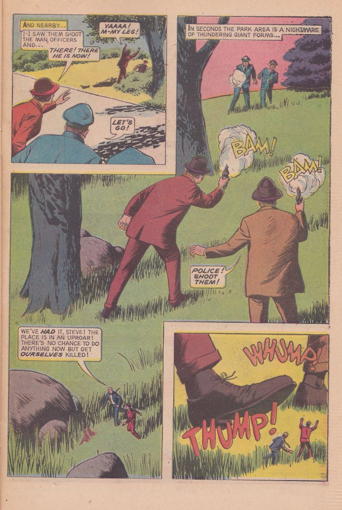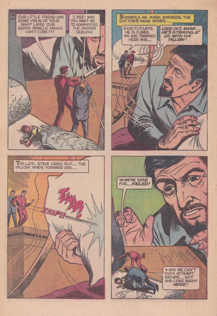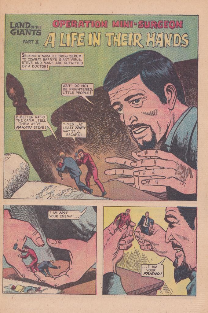 Land of the Giants was a short-lived comic book series published between 1968-1969 by Gold Key Comics. The artist that did the entire series was Dick Wood. The title of the comic book was used based on the television show of the same name. The series only lasted two seasons and I think it was one of Irwin Allen's most interesting creations. It's sort of a strange hybrid between Gulliver's Travels, Lost in Space, Planet of the Apes and the 1965 film Village of the Giants, which Allen undoubtedly borrowed his title from.