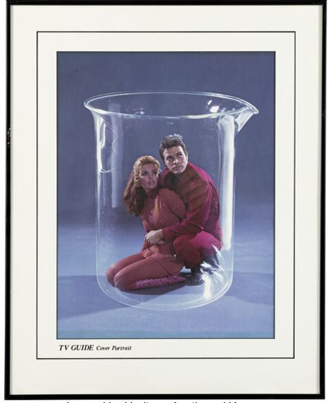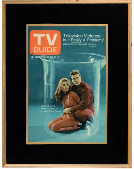 20" x 16" frame of Deanna Lund and Gary Conway from The Land of the Giants. Actual artwork reproduced on page 323 of "The Fantasy Worlds of Irwin Allen" by Jeff Bond, Creature Features 2019. Includes TV Guide cover photo plaque of Deanna Lund and Gary Conway measuring 10" x 8" in Lucite on wood base.