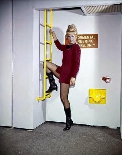 On September 1, 1966, one week before the first episode screened on NBC, Whitney, Shatner, and Nimoy were interviewed by Barbara Walters on The Today Show where they discussed the new show. The first promotional photographs for Star Trek also featured Shatner, Nimoy, and Whitney separately and together with pre-production costumes for all, and an early version of the "beehive" hairstyle