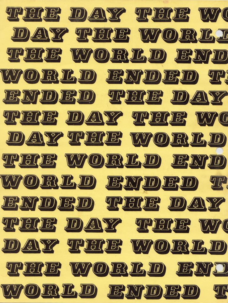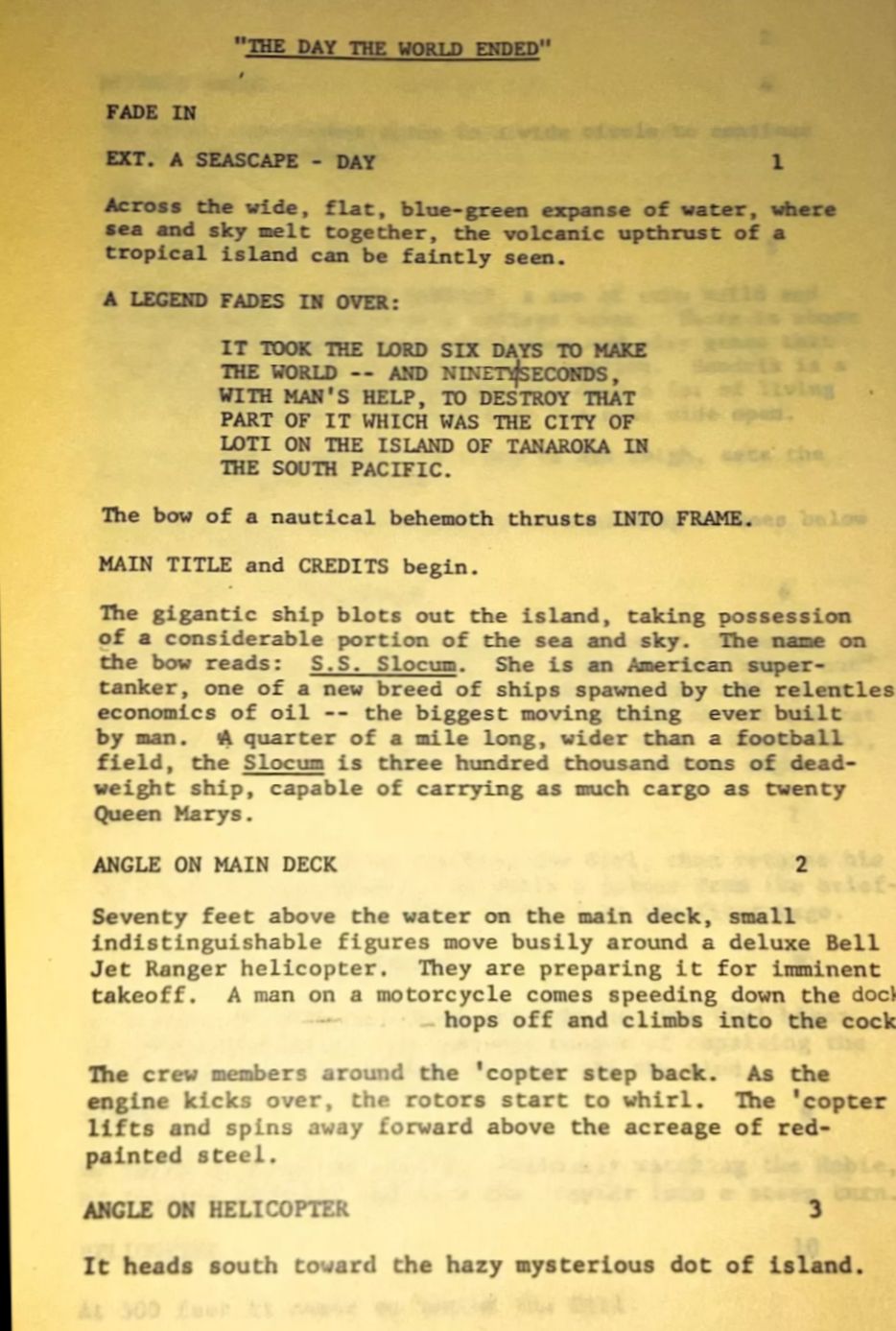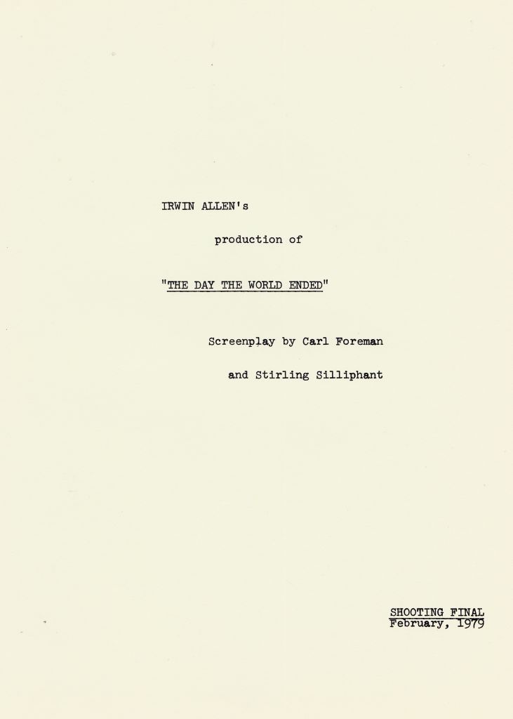 Irwin Allen's original production script revised 3-20-79 on the 1980 movie, "The Day the World Ended". As always with an all-star cast such as., Paul Newman, Jacqueline Bisset, William Holden, James Franciscus, Eddie Albert, Shelia Allen, Ernest Borgnine, Red Buttons, Barbara Carrera, and Valentina Cortessa.