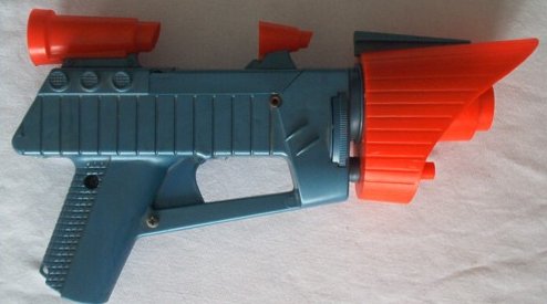 Powerful color rays, high speed atom chamber, tele video sights. Made from mold-in-color plastic, Remco's Space Gun has rather pedestrian design, but comes packaged in a stellar box complete with child-at-play artwork, a planet-filled night sky, and a futuristic city. Buy it for the box, but even loose, Remco's Electronic Space Gun provides good contrast to some truly innovative toy ray gun designs of the same period those created by Japanese tin-litho manufactures.