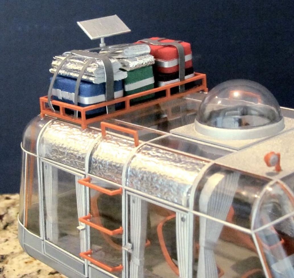 Model includes LED in headlights, fiber optics in dashboard instrument panels and radar scope, added headlight bezels, Lunar Models resin Robinson Family figures. Canopy sun shield, scratch built equipment cases, solar blankets and luggage straps. The diorama