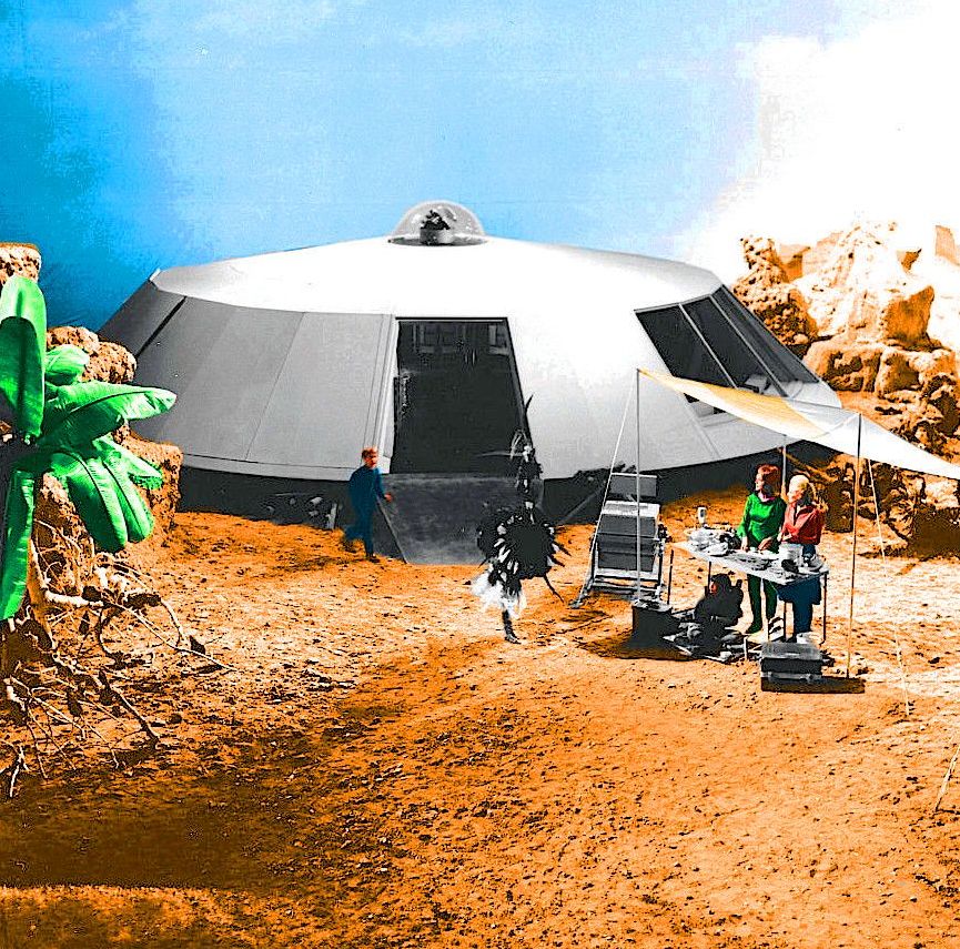The Jupiter-2 is the main spaceship on Lost in Space. It resembles a flying saucer on the exterior, with a dome on top, and a large viewport. The hull of the ship is made of titanium, although parts of it, including the hatch, are made of cosmium steel. In the first few episodes, it glows in most flight scenes, but this was dropped later on. It was launched on October 16, 1997, towards a planet of the star Alpha Centauri for the purpose of colonizing it. The Jupiter-2 mission cost about 30 billion dollars. There was presumably a Jupiter-1 which probably got sabotaged by the same organization, Aeolus 14 Umbra, who attempted to destroy the Jupiter-2. The ship also had artificial gravity which was only switched off temporarily in the first episode. The ship is the most sophisticated piece of hardware yet devised by the mind of human beings at the time of launch. Bold in concept and brilliant in execution, this most delicate yet most colossal of instruments makes possible travel to other worlds beyond our solar system. It is shown to take five and a half years for it to reach Alpha Centuari, although in later episodes it can travel through an entire galaxy within a day or less. The ship has movable walls and they can be removed to make more room in the ship. The spacecraft is propelled by atomic propulsion, using the substance deutronium as a power source. It also appeared to have an ion drive, and a magnetic drive. Small rockets came from unknown locations along the rim of the ship. the Jupiter-2 is also equip with an all terrain chariot vehicle.