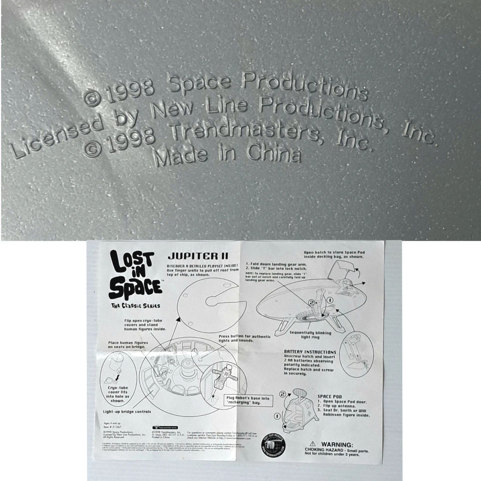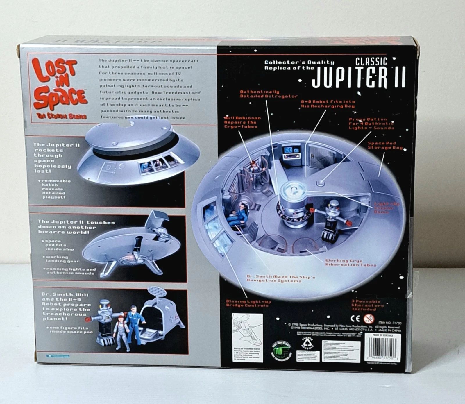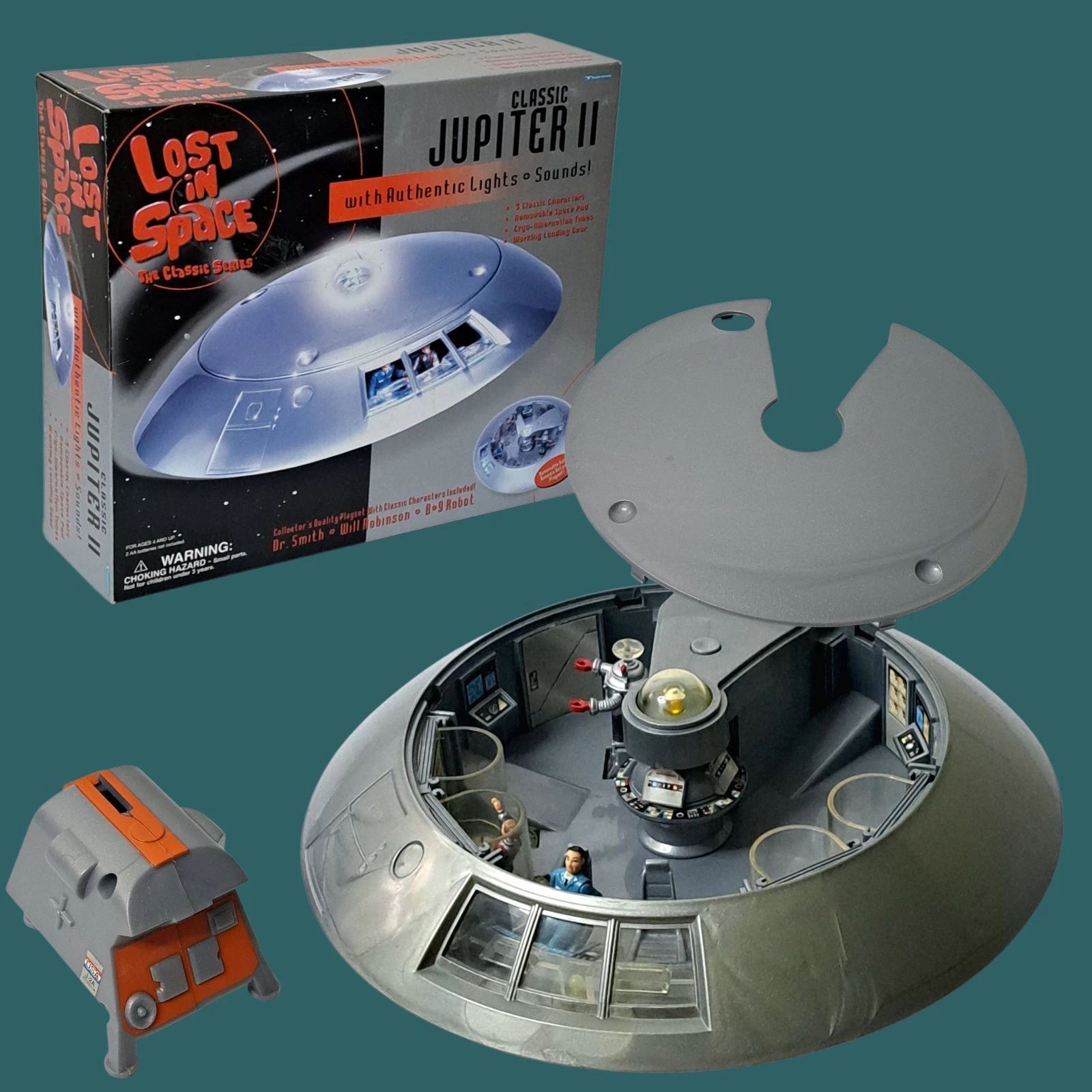 Lost on Space Jupiter-2 Trendmasters. We have what many think is the best Lost in Space toy ever produced. The Jupiter-2 playset includes an 11" plastic Jupiter-2. The ship features lights on the top and bottom sensor arrays, and a light in the cockpit. There are 3 separate sound effects that play when the lights are activated. The landing gear can be raised or lowered for flight or landing display. If you open the top, inside is a detailed interior, with a very good rendition of the ships details, although it is very simple compared to the TV shows set. In addition, they have included an undersized Space Pod, that has a small storage area on the Jupiter-2 you can place it in. The Space Pod can accommodate one of the three crew figures included with the set. And yes, it does include a small B9 robot, as well as Dr. Smith and Will Robinson. A very nice set, with lots of play possibilities, as well as being highly collectable.