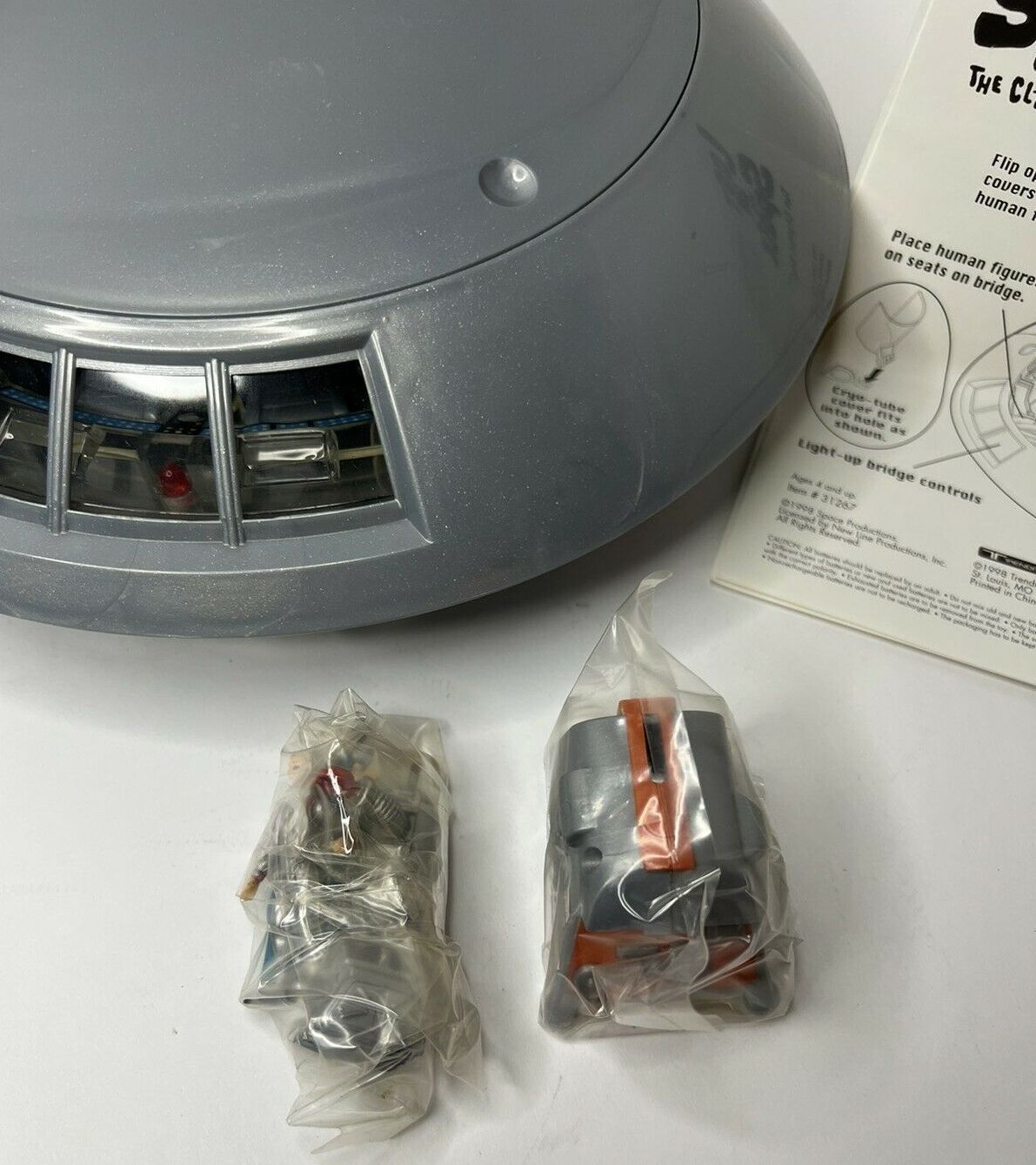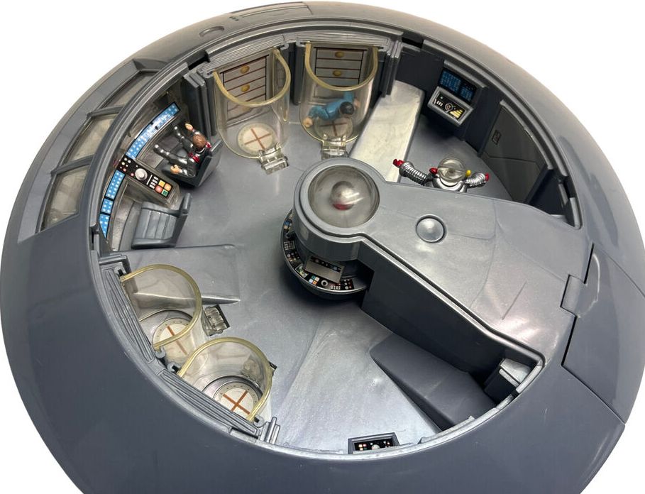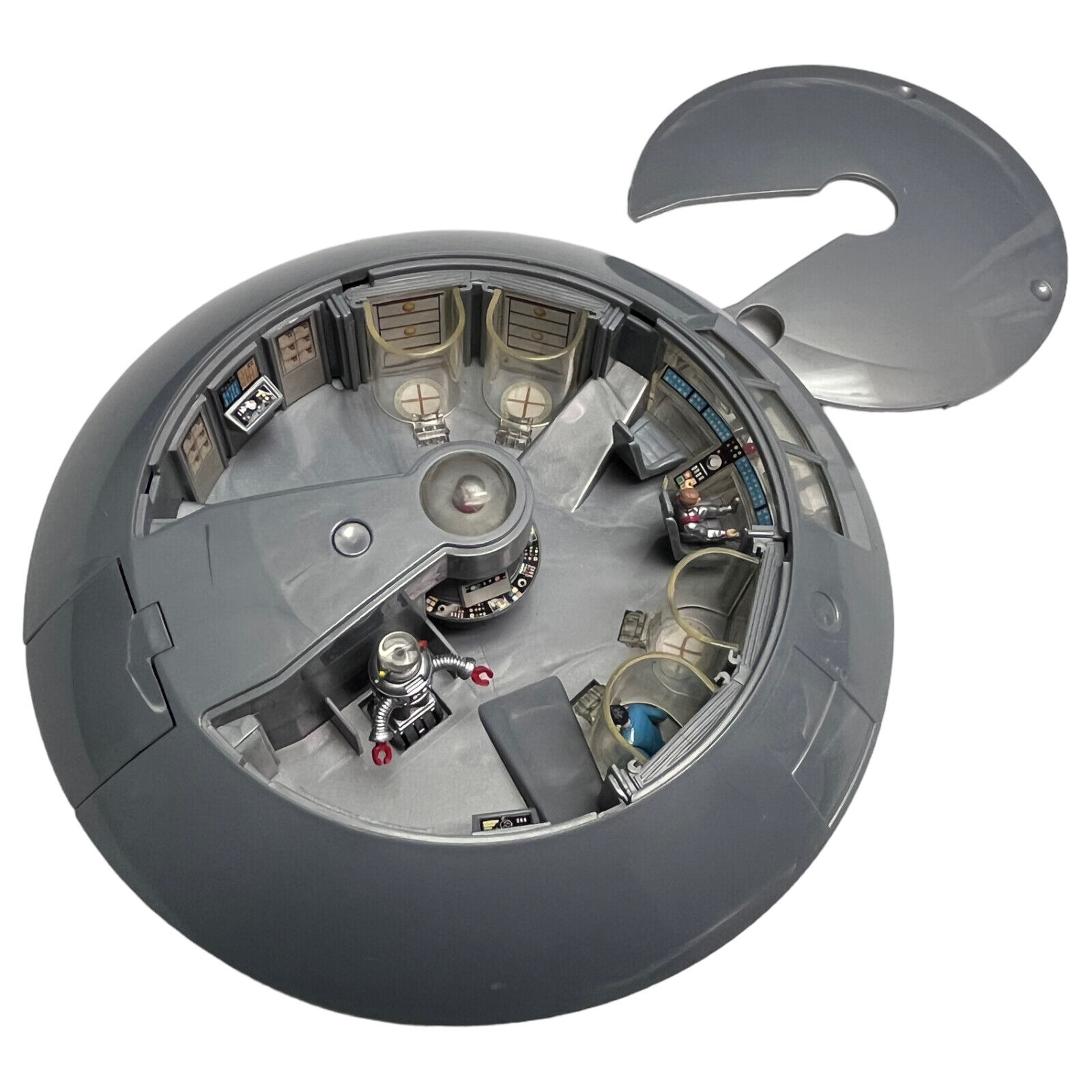 Lost on Space Jupiter-2 Trendmasters. We have what many think is the best Lost in Space toy ever produced. The Jupiter-2 playset includes an 11" plastic Jupiter-2. The ship features lights on the top and bottom sensor arrays, and a light in the cockpit. There are 3 separate sound effects that play when the lights are activated. The landing gear can be raised or lowered for flight or landing display. If you open the top, inside is a detailed interior, with a very good rendition of the ships details, although it is very simple compared to the TV shows set. In addition, they have included an undersized Space Pod, that has a small storage area on the Jupiter-2 you can place it in. The Space Pod can accommodate one of the three crew figures included with the set. And yes, it does include a small B9 robot, as well as Dr. Smith and Will Robinson. A very nice set, with lots of play possibilities, as well as being highly collectable.