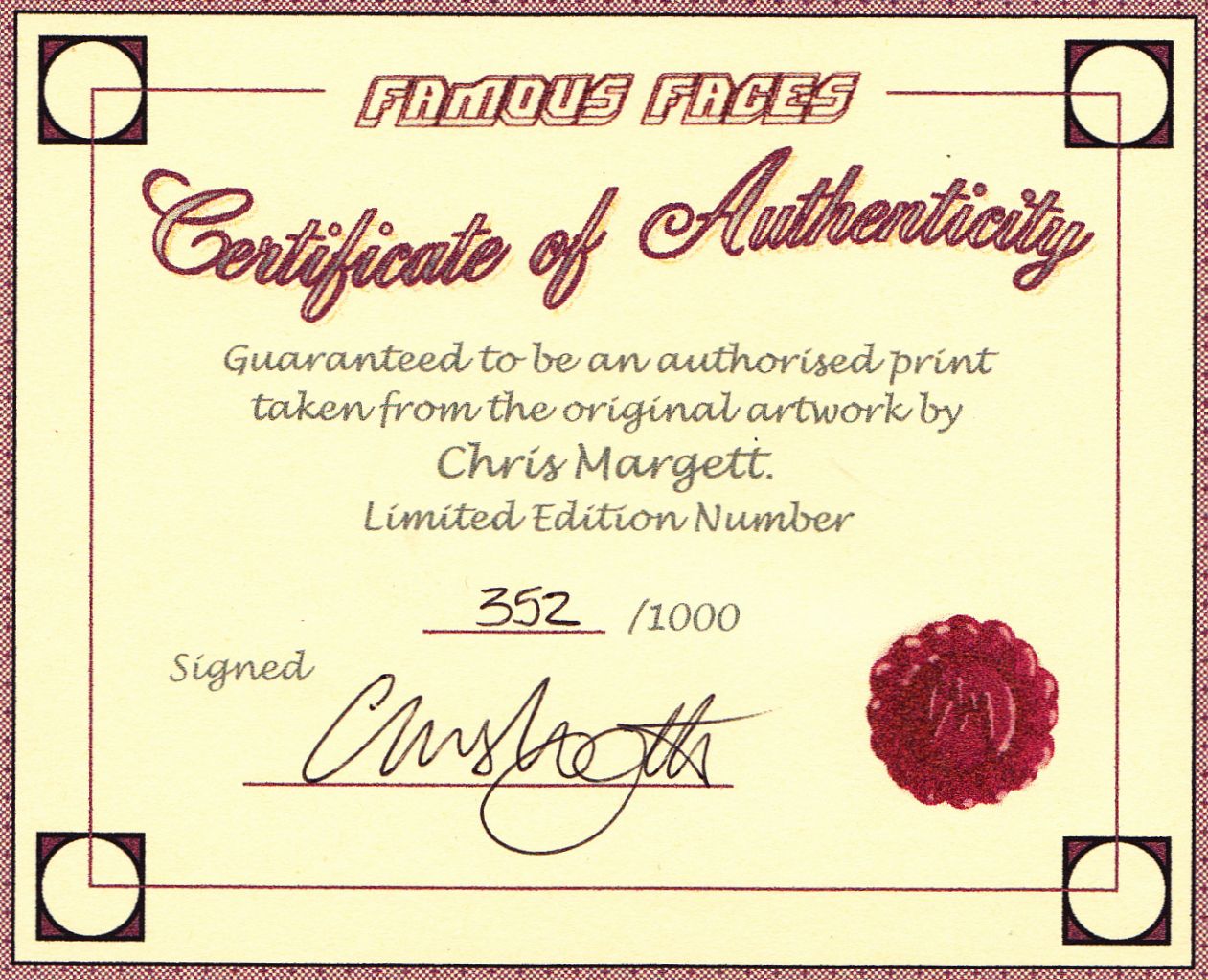An authorized print from original artwork by artist, Chris Margett. The print is signed and numbered by Chris Margett and comes with a certicate of authenticity, which is also signed and numbered. ( Part of the Famous Faces collection ) The print is mounted on a black card. The mount measures 36 x 28Ccm ( 15" x 11" ) externally. The print measures 28 x 21cm approx. ( 11" x 8" approx. ).