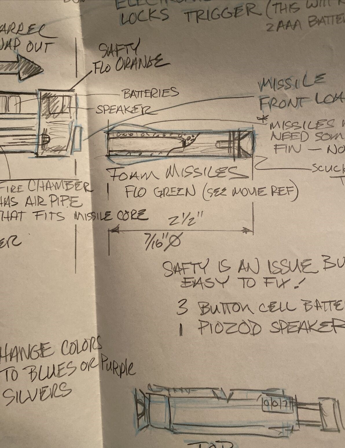 Early stage original prototype concept drawing artwork for the 1998 Trendmasters space blaster toy gun. Artwork was obtained from an x-employee that worked on this toy project. Incredible detail on this great toy!