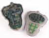 This lot consists of a futuristic plastic computer drive that features an exposed disc reader and a green display. Inside the drive is a green and black electronics board and on the back, two white plastic connectors. This lot exhibits scratches and chipping in the plastic, a cracked screen, a scratched disc, and missing power supply. Dimensions: 6" x 5" x 3" ( 15.25 cm x 12/75 cm x 7.75 cm )